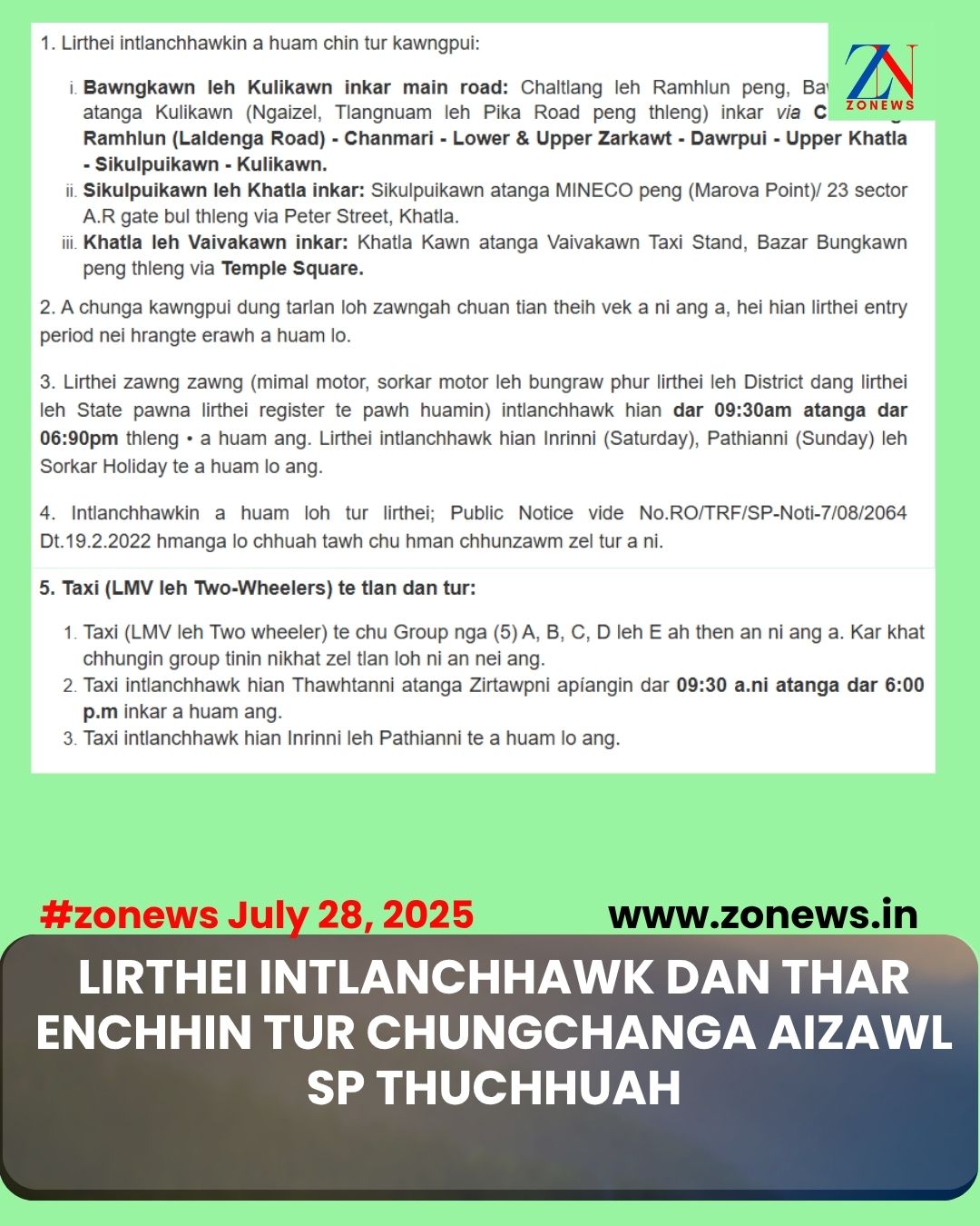 #ZONEWS Aizawl July 28, 2025 : Co-Ordination Committee on Traffic Management (CCTM) Meeting minutes vide Memo No.M-13/209/2025-UD&PA Dt.22.07.2025-in Aizawl khawpui chhunga lirthei intlanchhawk dan tur a ruahman leh Section 115 of MV Act, 1988-in thuneihna a pek angin Pu Ruatsanga Ralte, Sr. Superintendent of Police, Traffic, Aizawl chuan ni 01.08.2025 atanga ni 31.08.2025 thlenga enchhin turin a hnuaia mi ang hian lirthei tlandan tur ruahmanna a siam.
