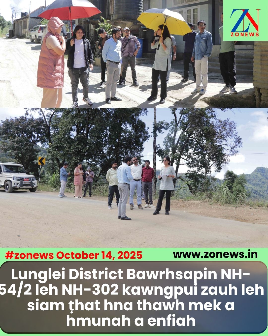 #ZONEWS Lunglei October 14, 2025: Vawiin khan Lunglei District Bawrhsap & Competent Authority for Land Acquisition (CALA) Pi Navneet Mann chuan National Highway-54/2 leh NH-302 kawngpui laih zauh leh siam ṭhat hna thawh meka Theiriat, Hrangchalkawn leh Zobawk huam chhunga hma lakna hrang hrang chu a hmunah kal chilhin a enfiah.