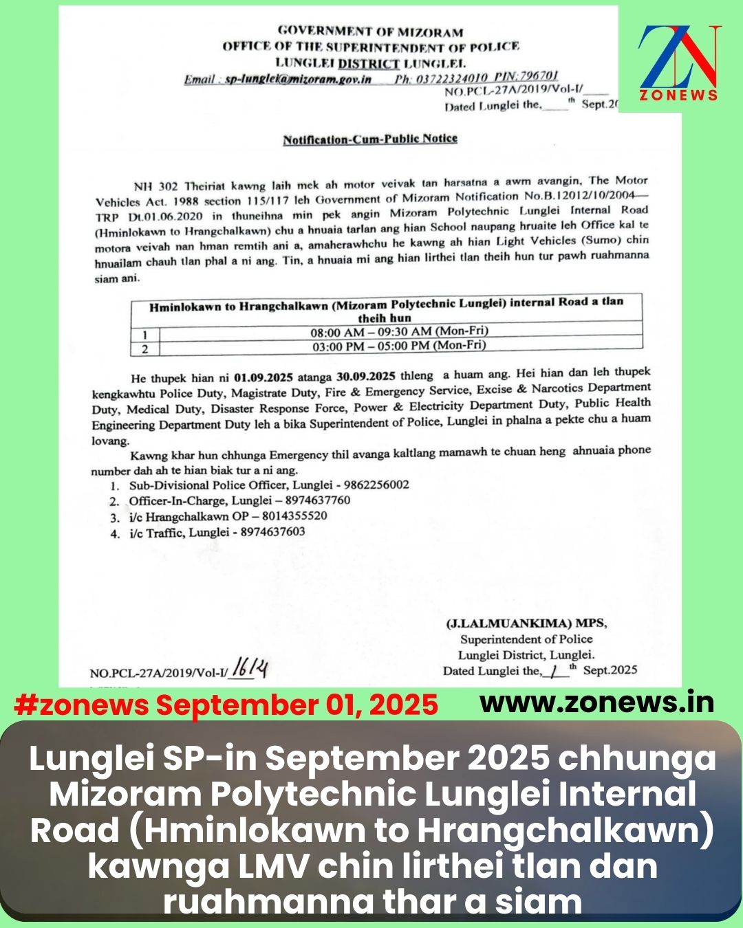 #ZONEWS Lunglei September 1, 2025: NH 302 Theiriat kawng laih mekah motor veivak tan harsatna a awm avangin, Lunglei District Superintendent of Police Pu J. Lalmuankima chuan vawiin khan The Motor Vehicles Act 1988 section 115/117 leh Government of Mizoram Notification No.B.12012/10/2004-TRP Dt. 01.06.2020 tlawh chhanin Mizoram Polytechnic Lunglei Internal Road (Hminlokawn to Hrangchalkawn) chu school naupang hruaite leh office kalte motora veivah nan hman remtih a nih thu hriattirna a chhuah a. Amaherawhchu, he kawngah hian Light Vehicle (Sumo) chin hnuai lam chauh tlan phal a ni ang tih a tar lang.
