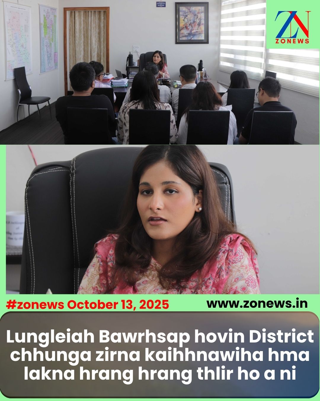 #ZONEWS Lunglei October 13, 2025: Vawiin khan Lunglei District Bawrhsap Pi Navneet Mann hovin a hna thawh pindanah Lunglei Deputy Commissioner (Bawrhsap) hma laknaa Lunglei District leh Lungsen Aspirational Block-a zirna tihhmasawnna tur hma lakna hrang hrang kalpui mekte thlir ho a ni.