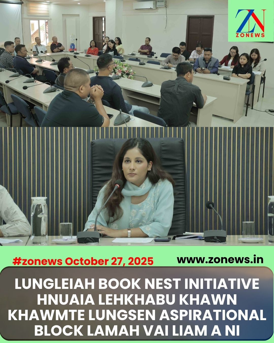 #ZONEWS Lunglei October 27, 2025: Lunglei District Deputy Commissioner (Bawrhsap) bul tuma Book Nest Initiative hnuaia Lungsen Aspirational Block-a zirlaite tana zirlaibu, thawnthu bu leh lehkhabu khawn khawmte chu vawiin khan Lungsen Block chhunga sikul hrang hranga sem darh turin Lunglei Bawrhsap Pisa tual aṭangin Bawrhsap Pi Navneet Mann leh Lunglei Sub-Headquarters YMA President Pu K. Lalfakzuala te’n an vai liam.