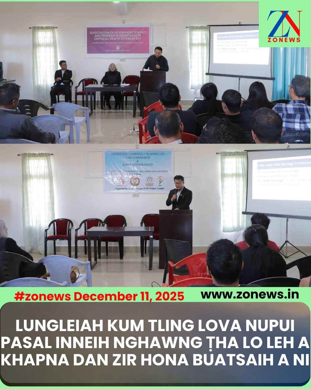 #ZONEWS Lunglei December 11, 2025: Vawiin khan Women & Child Development (WCD), Health & Family Welfare (H&FW), School Education Department leh Lunglei District Legal Services Authority (DLSA) te ṭang ho huaihawtin Lunglei DPO Conference Hall-ah kum tling lova nupui pasal inneihin nghawng ṭha lo a neihte leh a khapna dan zir hona, “Awareness Campaign/Training on Child Marriage & Early Motherhood” buatsaih a ni.