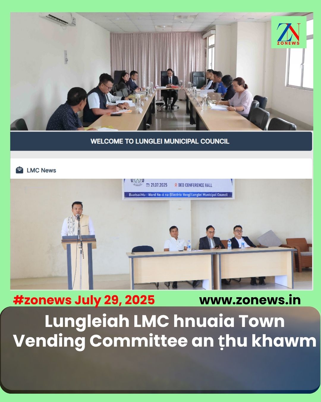#ZONEWS Lunglei July 29, 2025: Vawiin khan Lunglei Municipal Council (LMC) Town Vending Committee chu LMC Chief Executive Officer Pu Donny Lalruatsanga kaihhruaiin LMC BoC Meeting Hall-ah a ṭum khat nan an ṭhu khawm a. Lunglei khawpui chhunga kawng kama thil zuara inpho chungchangah inkaihhruaina leh inkhuahkhirhna felfai zawka kalpui dan tur an sawi ho.