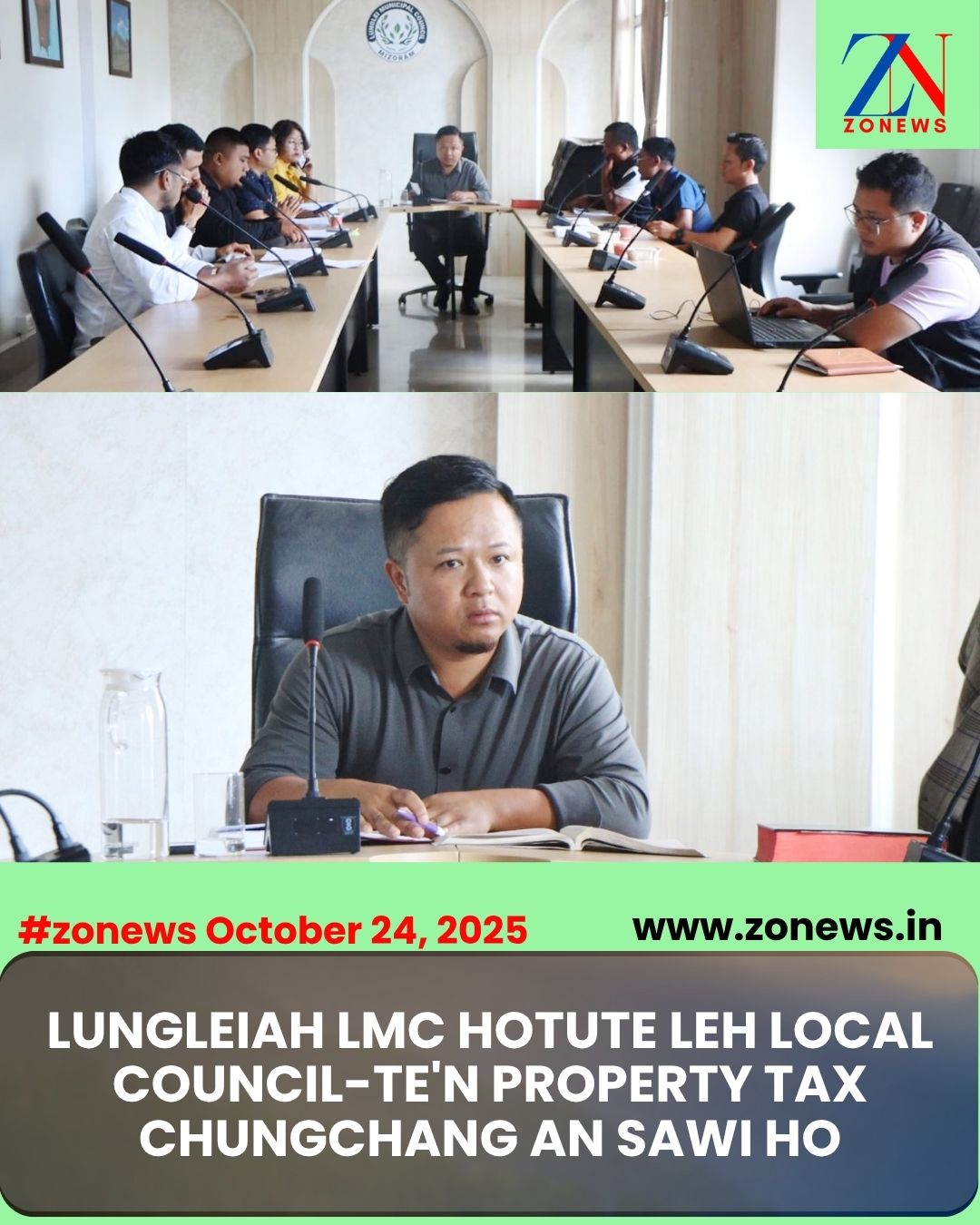 #ZONEWS Lunglei October 24, 2025: Nimin khan Lunglei Convention Centre-a BoC Meeting Hall-ah Lunglei Municipal Council (LMC) Executive Councillor Pu Zorinsanga Hmar kaihhruaiin LMC hotute leh Local Council ai awhte chuan LMC-in Lunglei khawpui chhunga in leh lo chhiah, “Property Tax” a khawn mek dik tak leh felfai taka kalpui a nih theih dan tur an sawi ho va. Chhiah pek tur zat en nawn (re-assess) dan tur leh sawisel duh neite tana complaint siam dan tur te ruahman a ni.