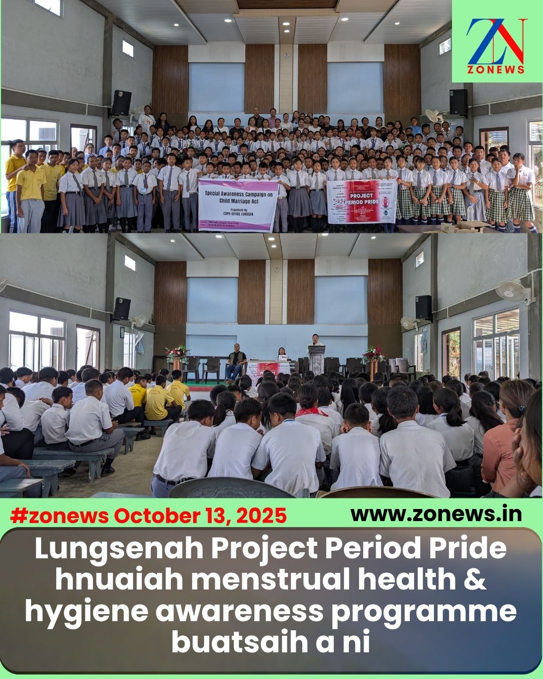 #ZONEWS Lunglei October 13, 2025: Lunglei District-a hmeichhe zirlai naupangte zinga hmeichhe hun bi kaihhnawih hriselna leh thianghlimna (menstrual health & hygiene) chungchang inzirtirna atana Lunglei District Bawrhsap hma lakna, “Project Period Pride” hnuaiah vawiin khan Lungsen Chhimveng Hall-ah awareness programme buatsaih a ni.