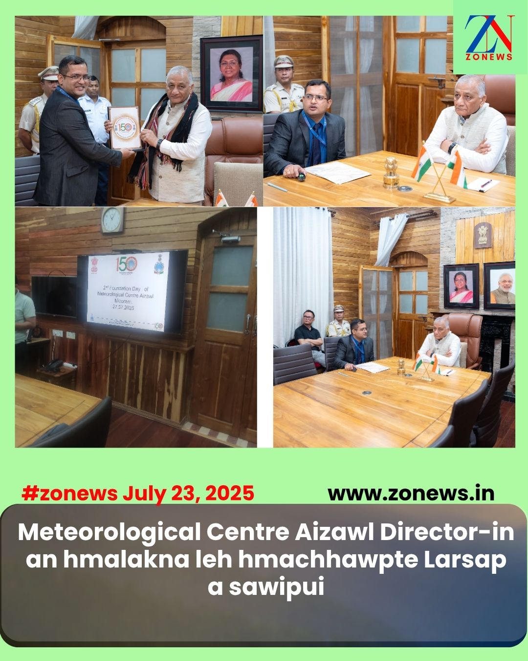 #ZONEWS July 23, 2025: Vawiin khan Pu Sudheer Kumar Dwivedi, Director & Head, Meteorological Centre Aizawl, India Meteorological Department (IMD) chuan Larsap, General (Dr) Vijay Kumar Singh, PVSM, AVSM, YSM (Retd) chu Raj Bhavan-ah hmuin an hmalakna leh hmachhawpte a sawipui.