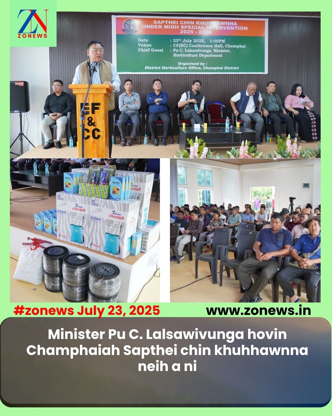 #ZONEWS Champhai, July 23, 2025: Vawiin chawhnu dar 1 khan MIDH Special Intervention hnuaia Sapthei chin khuhhawnna chu Conservator of Forest Auditorium, Champhai Bethel Vengah neih a ni a, Horticulture Minister Pu C. Lalsawivunga chuan khuallian niin a hmanpui a, Horticulture Department Director Pu C.H. Lalmuanpuia’n hun a kaihruai a ni.