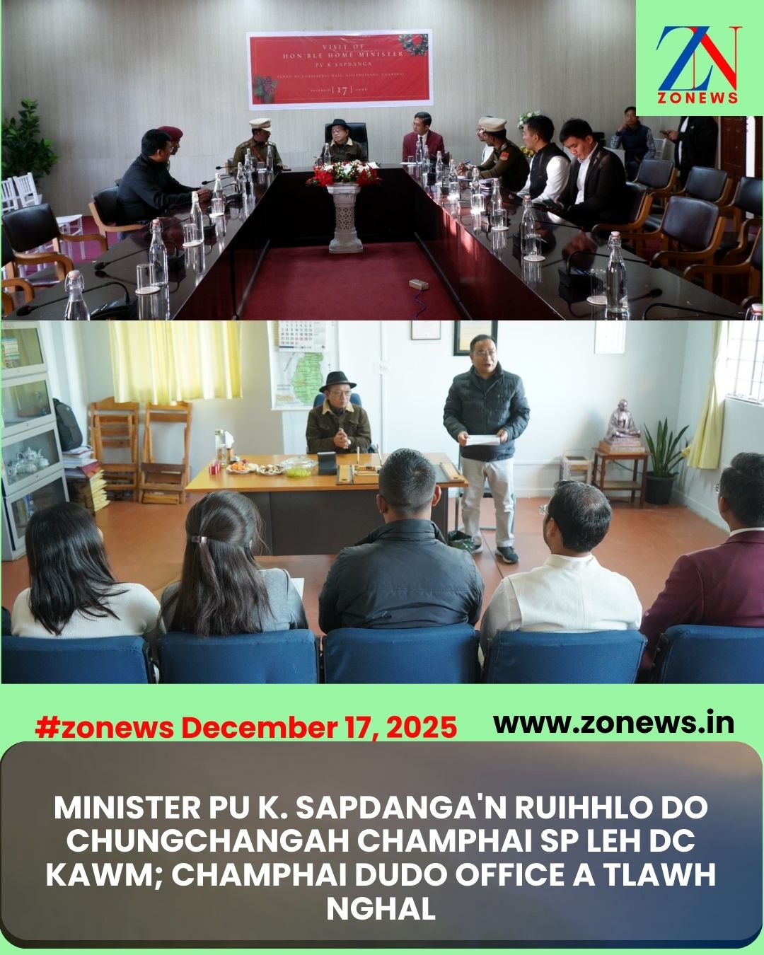 ##ZONEWS Champhai December 17, 2025: Home Minister Pu K. Sapdanga chuan vawiin khan Champhaia ruihhlo do chungchangah Champhai DC Conference Hall-ah Champhai SP Pu Lokeshwaran R leh Addl. DC Pu James Lalnithanga a kawm.