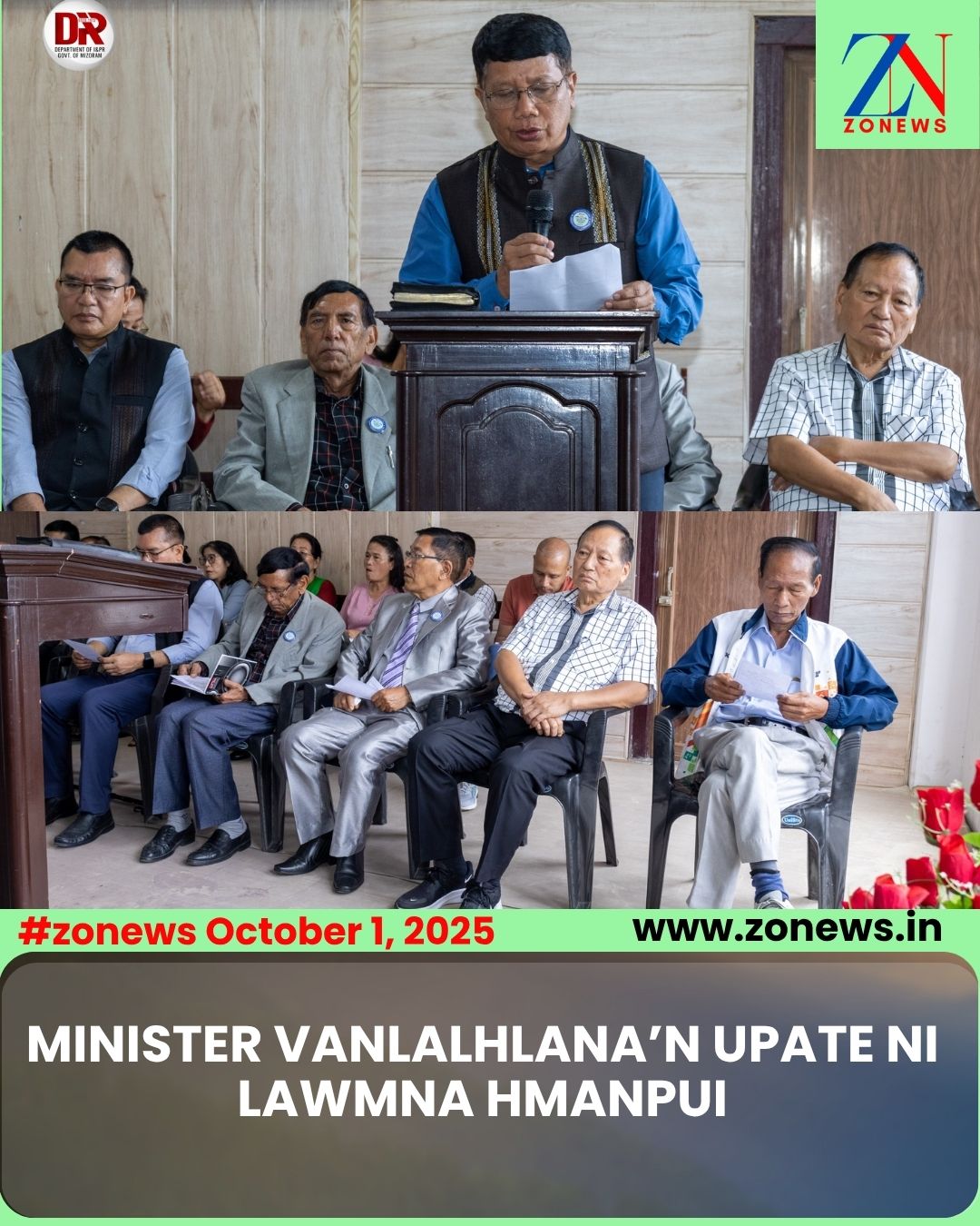 #ZONEWS Aizawl, October 1, 2025: Vawiin khan Public Works Department Minister Pu Vanlalhlana chuan Chaltlang Lily Venga ‘Upate Ni’ lawmna program chu Baptist Kohhran Hall, Lily Vengah khuallian niin a hmanpui.