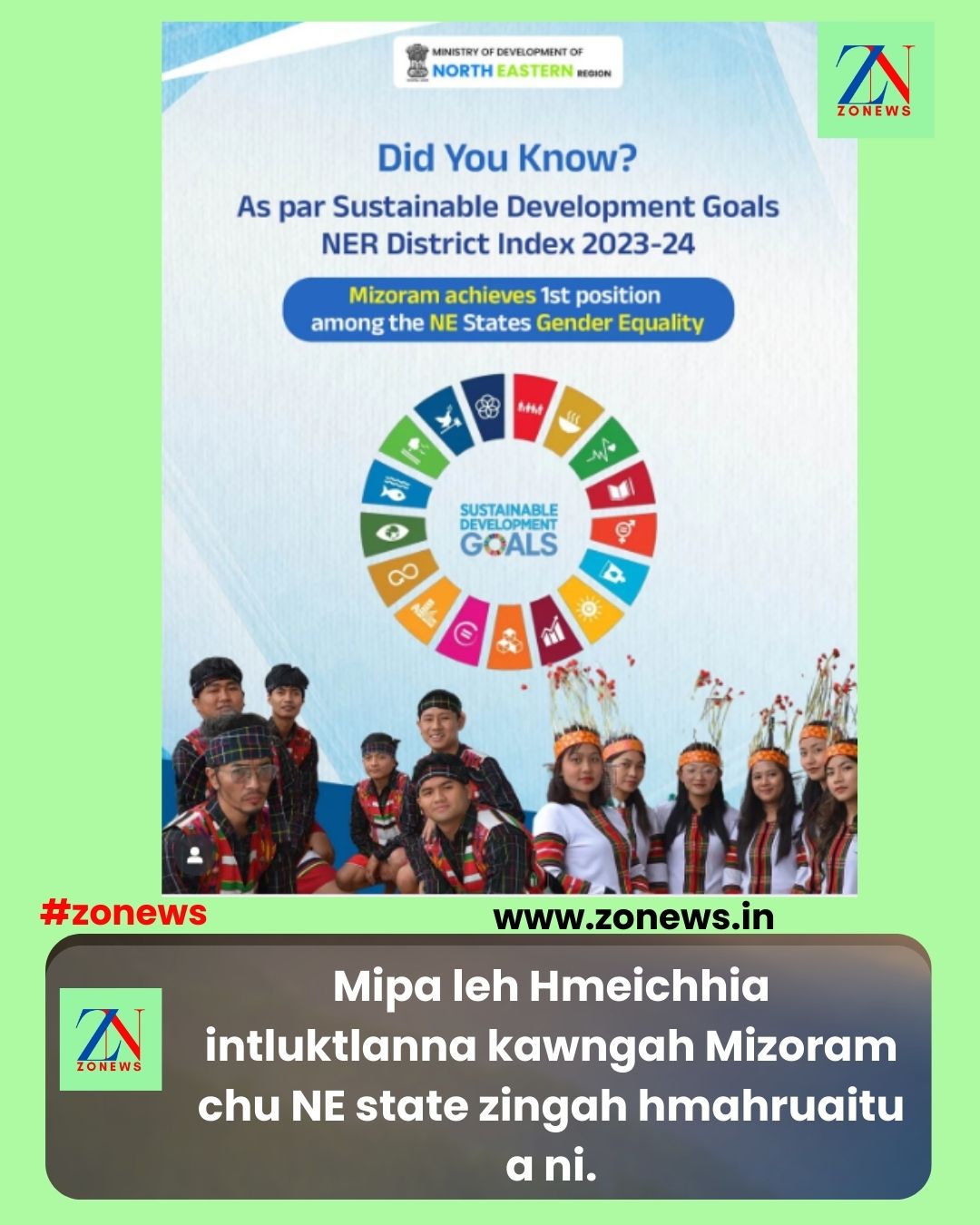 #ZONEWS July 14, 2025: SDG NER District Index 2023–24 in a tarlan danin Mizoram chu Northeast State zawng zawng zingah Hmeichhia leh Mipa intluktlanna kawnga hmahruaitu, pakhatna a nih thu a sawi a. Hei hian kawng hrang hranga hmasawnna kawngah a tha zawngin state tan nghawng a nei ngei ang tiin DoNER India chuan an instagram page lamah an tarlang nghe nghe a ni.
