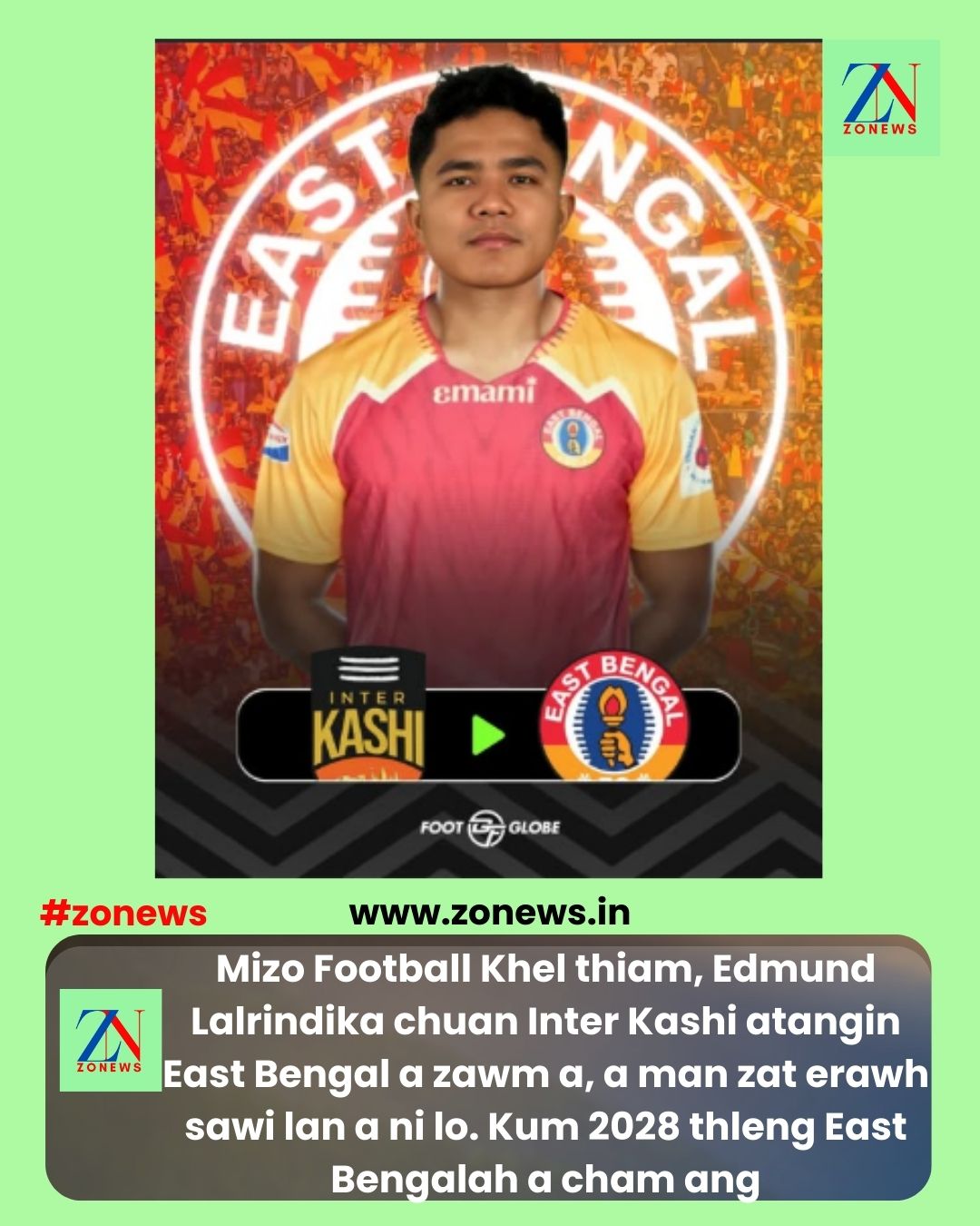 #ZONEWS #INFIAMNA July 12, 2025: Mizo Tlangval a inkhelh thiam avanga India ram pawhin a hriat lar, Edmund Lalrindika chuan a khelhna I-League club, Inter Kashi chhuahsanin, ISL Club, East Bengal a zawm fel ta a. An inleina man zah erawh puanzar a ni lo. East Bengah hian kum 2028 thleng a cham dawn a ni.
