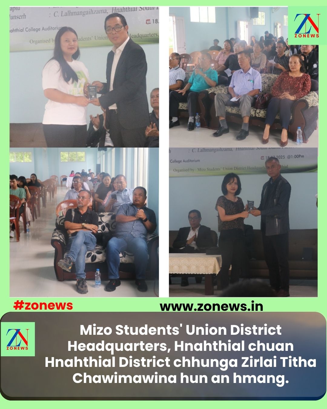 #ZONEWS July 18, 2025: Vawiin chawhnu dar 1:00 khan Govt. Hnahthial College Auditorium-ah Mizo Students’ Union District Headquarters, Hnahthial chuan Hnahthial District chhunga Zirlai Titha Chawimawina hun an hmang a. He hun hi Pu Zothanmawia Khiangte Addl. DC chuan khuallian niin a hmanpui a ni.