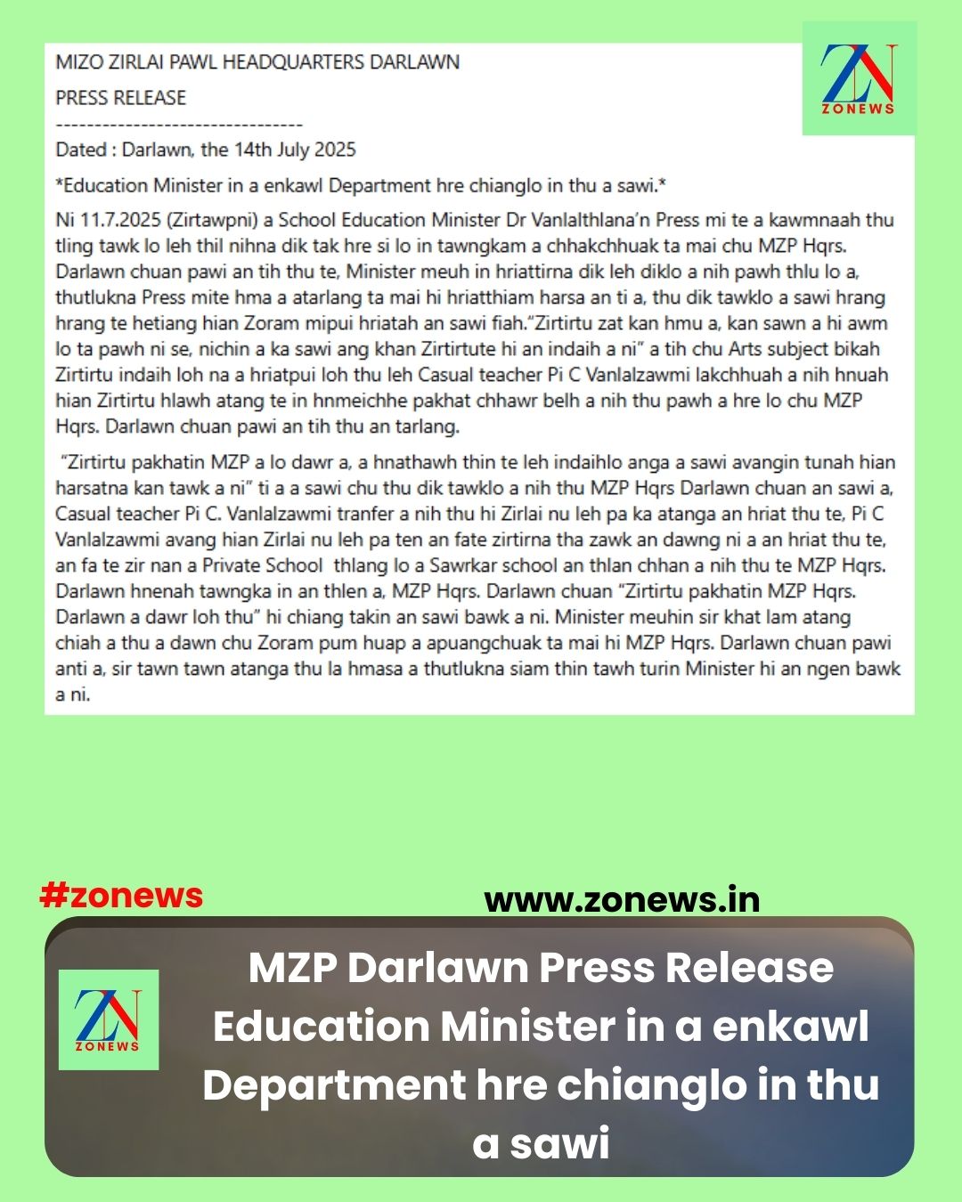 #ZONEWS July 14, 2025: Ni 11.7.2025 (Zirtawpni) a School Education Minister Dr Vanlalthlana’n Press mi te a kawmnaah thu tling tawk lo leh thil nihna dik tak hre si lo in tawngkam a chhakchhuak ta mai chu MZP Hqrs. Darlawn chuan pawi an tih thu te, Minister meuh in hriattirna dik leh diklo a nih pawh thlu lo a, thutlukna Press mite hma a atarlang ta mai hi hriatthiam harsa an ti a, thu dik tawklo a sawi hrang hrang te hetiang hian Zoram mipui hriatah an sawi fiah.“Zirtirtu zat kan hmu a, kan sawn a hi awm lo ta pawh ni se, nichin a ka sawi ang khan Zirtirtute hi an indaih a ni” a tih chu Arts subject bikah Zirtirtu indaih loh na a hriatpui loh thu leh Casual teacher Pi C Vanlalzawmi lakchhuah a nih hnuah hian Zirtirtu hlawh atang te in hnmeichhe pakhat chhawr belh a nih thu pawh a hre lo chu MZP Hqrs. Darlawn chuan pawi an tih thu an tarlang.