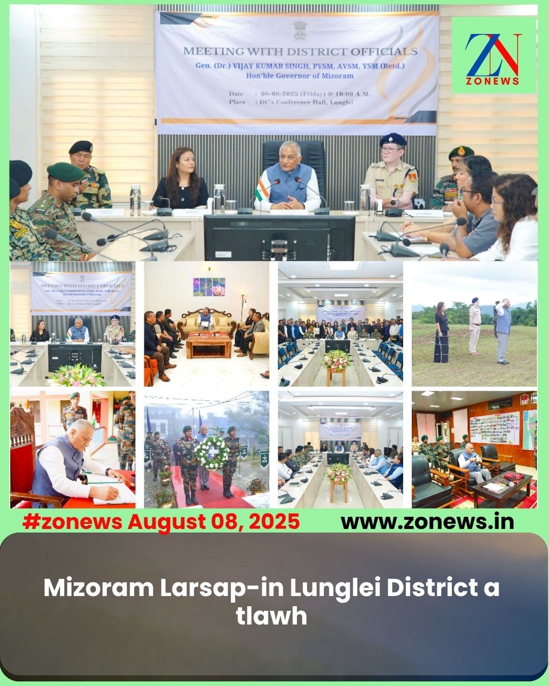 #ZONEWS Aizawl August 08, 2025: Mizoram Larsap General (Dr) Vijay Kumar Singh, PVSM, AVSM, YSM (Retd) chuan vawiin khan lehlangin Lunglei District a tlawh. Sawrkar department hotute, tlawmngai pawl leh Kohhran hruaitute leh Ex-Servicemen-te a kawm a. 20 Assam Rifles Hqrs. tlawhin sipaite a kawm a, War Memorial-ah sipai martarte zahna lantir nan pangpar a dah bawk.