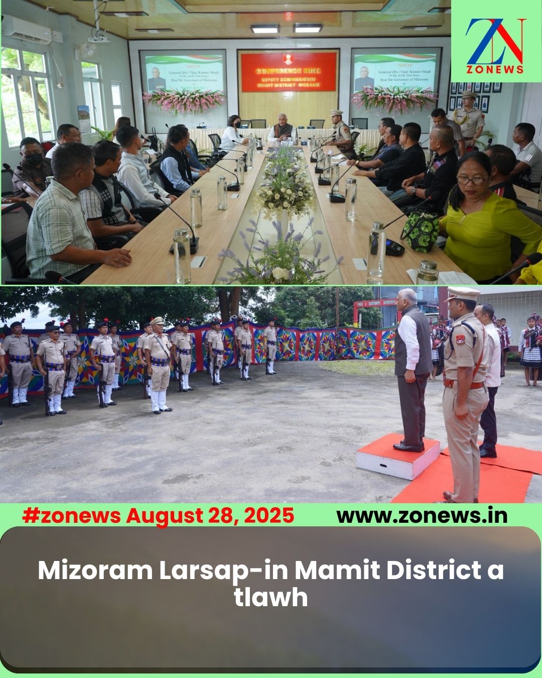 #ZONEWS Aizawl August 28, 2025: Mizoram Larsap General (Dr) Vijay Kumar Singh, PVSM, AVSM, YSM (Retd) chuan vawiin khan Mamit District a tlawh. He hunah hian Sawrkar department hotute, tlawmngai pawl aiawhte, Political party hruaitute leh Ex-Servicemen-te kawmin Aspirational District hnuaia hmalaknate a tlawh bawk a. Larsap hi Mamit Tourist Lodge tualah Mamit DC Pu K.Laltlawmlova, SP Pu Manny Bhushan Singh leh official dangte’n lo hmuakin Guard of Honour pek a ni.