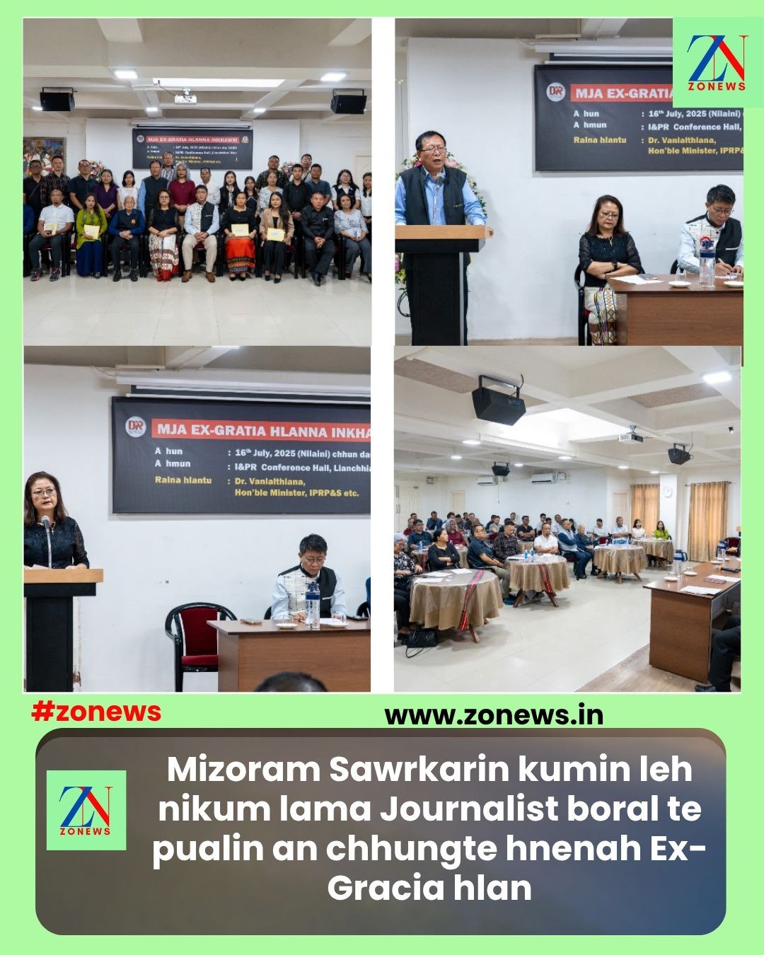 #ZONEWS July 16, 2025: Vawiin khan, Information & Public Relation, Printing and Stationary Department changtu Minister Dr. Vanlalthlana chuan I&PR Conference Hall, Lianchhiari Run, Aizawlah, nikum leh kumina Mizoram Journalist Association (MJA) member boral ta te pualin lusun chhungte hnenah Sawrkar ralna thilpek(Ex-gratia ) a hlan.