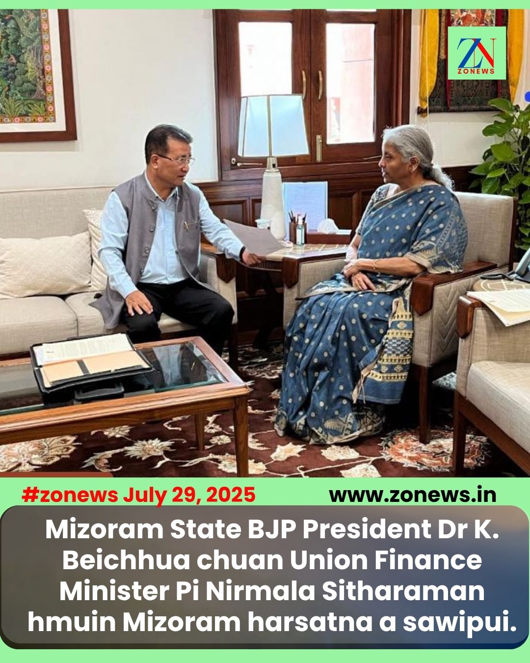 Mizoram State BJP President Dr K. Beichhua chuan Union Finance Minister Pi Nirmala Sitharaman hmuin Mizoram harsatna a sawipui.