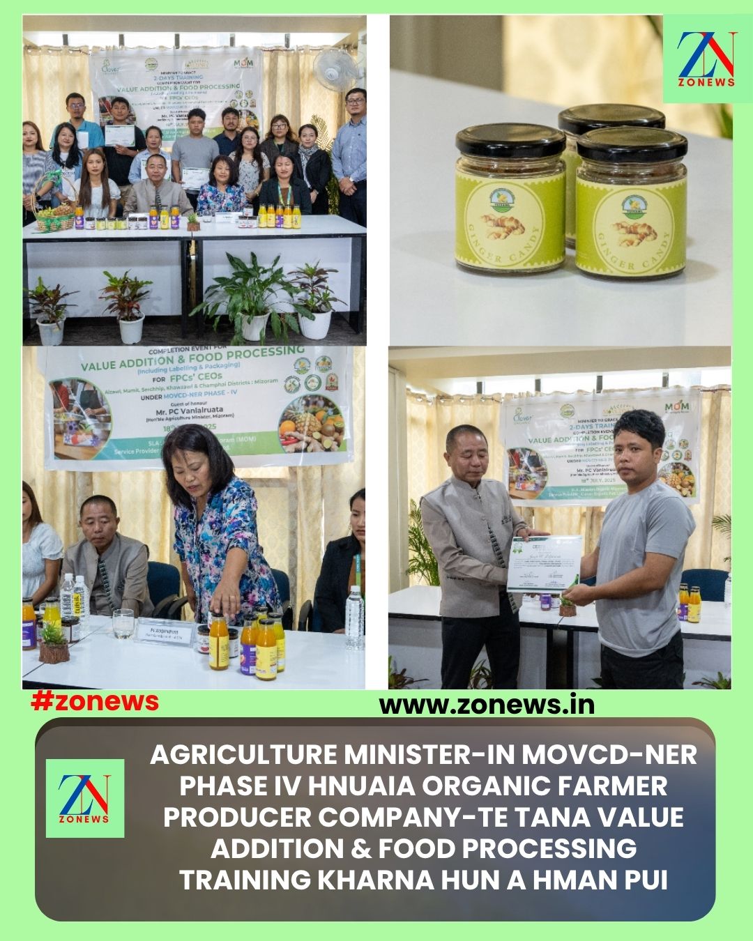 #ZONEWS July 18, 2025: Vawiin chawhma khan Mission Organic Value Chain Development For North East Region (MOVCD – NER) Phase IV hnuaia Clover Organic bultuma ni 2 awh, ‘Value Addition & Food Processing Training’ kharna hun chu, Clover Organic Pvt. Ltd. Office, Chanmari, Ramhlun road-ah Agriculture & Farmers Welfare Minister Pu PC Vanlalruata hovin hman a ni a. Pi PC Lalngaihsaki, Asst. Project Officer, Clover Organic Pvt. Ltd. chuan hun kaihruaiin Pi H.Zodinpuii, State Coordinator, Mission Organic Mizoram chuan a telpui a ni.