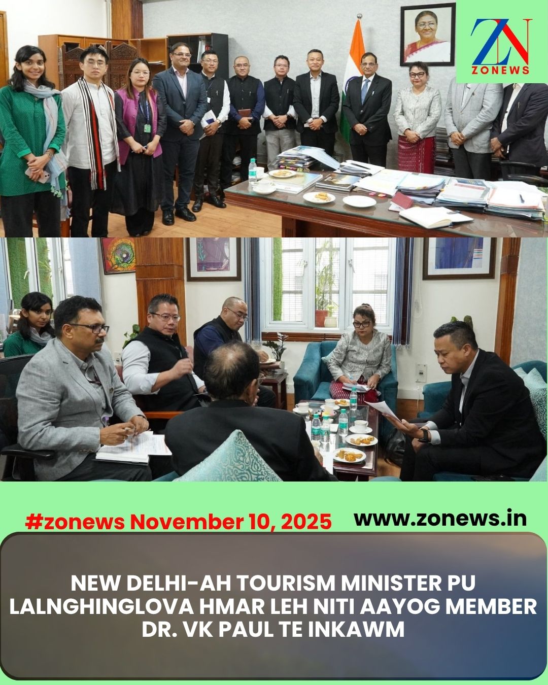 #ZONEWS Aizawl November 10, 2025: New Delhi-a cham mek Pu Lalnghinglova Hmar, Minister of State, Tourism Department leh Dr. VK Paul, Member, NITI Aayog te chu vawiin chawhnu khan New Delhi-a NITI Aayog Headquarters-ah an inkawm a, Mizoram tourism hmasawnna tur chungchang ngaihtuahin hma lakho dan tur an sawiho.