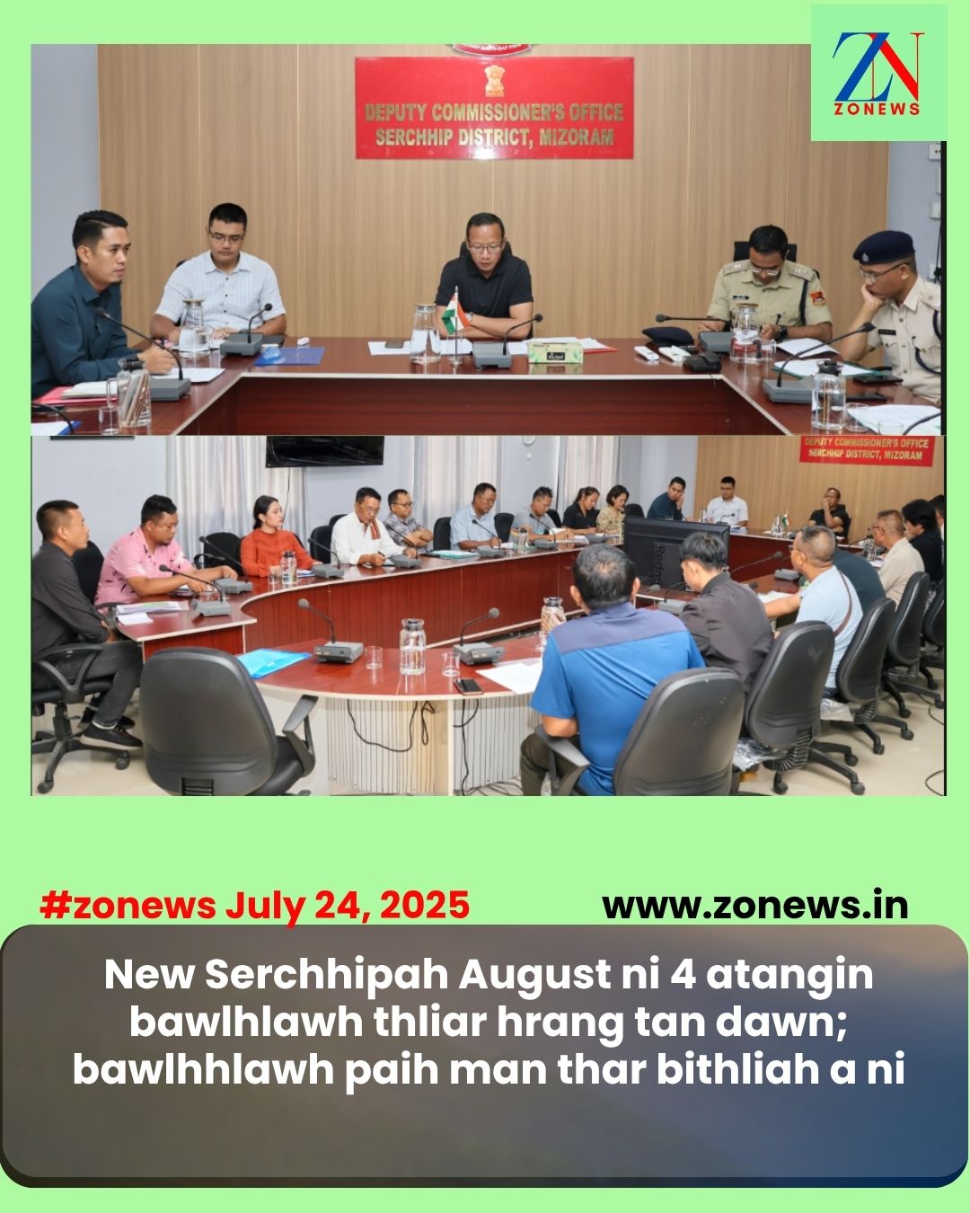 #ZONEWS Serchhip, July 24, 2025: Vawiin khan Serchhip Sanitation Task Force chu an Chairman Pu Paul L Khuma hoin Serchhip DC Meeting Hall-ah an thukhawm. August ni 4 atanga New Serchhip area chhunga hman tan tur bawlhhlawh tawihthei leh thei lo thliar chungchang te, Serchhip khawpui pumpuia kalpui dan tur te leh bawlhhlawh paih man thar bithliah chungchang te an rel.