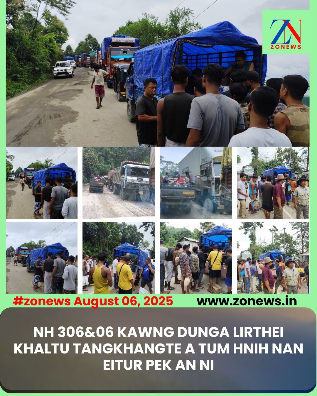 #ZONEWS Kolasib August 06, 2025: Vawiin tlai khan tun inrinna kalta a Pu K Sapdanga, Home Minister leh Pu TBC Lalvenchhunga, Adviser to CM ruahmmanna leh nimin lama Pu Lalfamkima, Bialtu MLA leh deputy speaker ni bawk kaihhruaina hnuaia Pu Robert C Lalhmangaiha, Kolasib DC leh Pu David H Lalthangliana, Kolasib Sr SP te leh Department kaihhnawih thenkhat te thurel bawhzuiin vawiin chawhnu khan NH 306&06 kawng dunga lirthei tangkhang driver te hnenah ei tur leh tui thianghlim pek an ni.