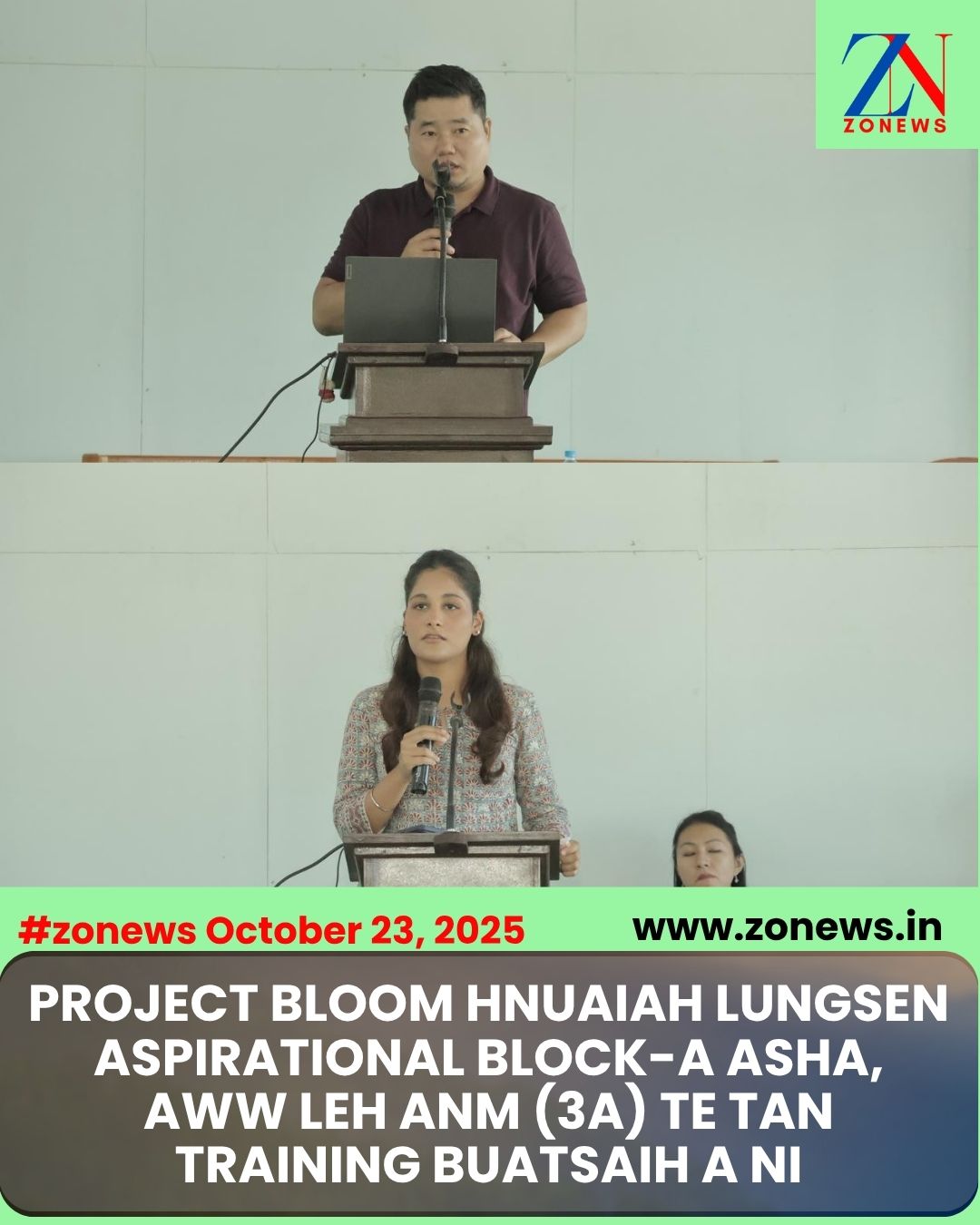 #ZONEWS Lunglei October 23,, 2025: Lunglei District Bawrhsap hma lakna, Project BLOOM (Better Living through Outreach, Optimal Maternal & Child Health) kal tlanga Lungsen Aspirational Block huam chhunga nu leh naupang hriselna atana hma laknaah hmasawnna ṭha zawk hmuh a nih theih nan, vawiin khan Lungsen Hmar Veng YMA Hall-ah thawktu lungthu pathum (3A) – ASHA, Anganwadi Worker leh ANM (health & wellness officer leh health worker) te tan capacity building programme buatsaih a ni.