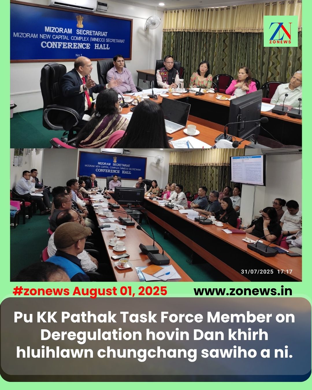 #ZONEWS Aizawl August 01, 2025: Nimin chawhnu khan Pu K.K. Pathak, Special Secretary, Cabinet Secretariat leh Task Force Member on Deregulation hovin Secretariat Conference Hall, MINECO-ah review meeting neih a ni a. Chief Secretary Pu Khilli Ram Meena kaihhruai meeting-ah hian state-in deregulation a kalpui mek chungchang thlirho a ni a, phurrit tihziaawmna lam hawia state sawrkarin dan hrang hrang, abikin sumdawnna lam hawia a lo zam te siam that dan tur chungchang pawh sawiho a ni.