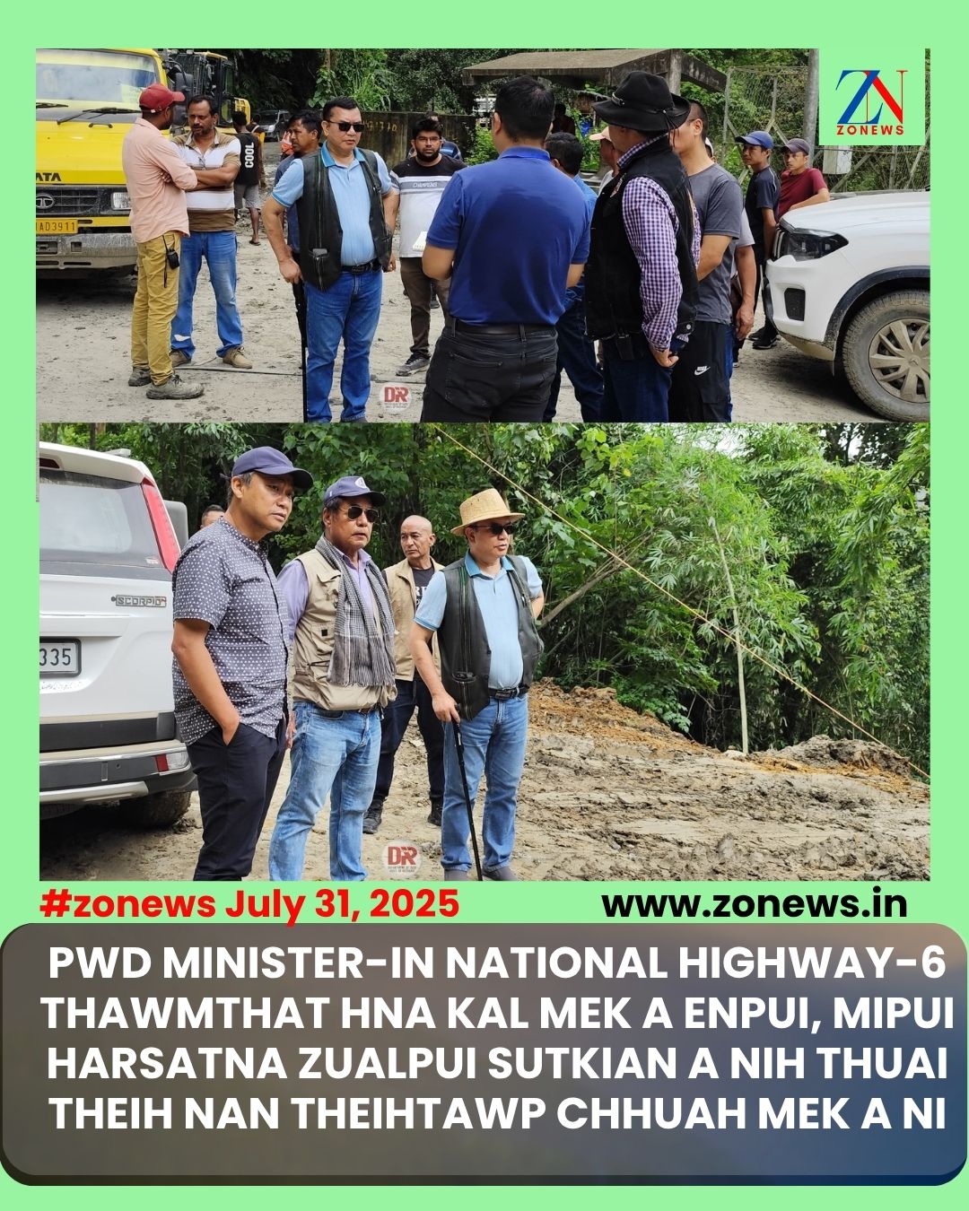 #ZONEWS Aizawl July 25, 2025: Vawiin khan Pu Vanlalhlana, Minister, Public Works Department chuan National Highway – 6, Sairang – Buichali – Kawnpui inkar kawng thawmthat hna kalpui mek chu a hmun ah kalin a endik a. Sports & Youth Services Minister Pu Lalnghinglova Hmar leh Pu Lalchhuanthanga, MLA-te chuan PWD Minister hi tawiawmin Er. H.Zoramliana, E-in-C, Er. David Sapzova, CE (Roads), PWD-a thawktute leh Kawnpui leh Khamrang khawtlang hruaitute an tel bawk a ni.