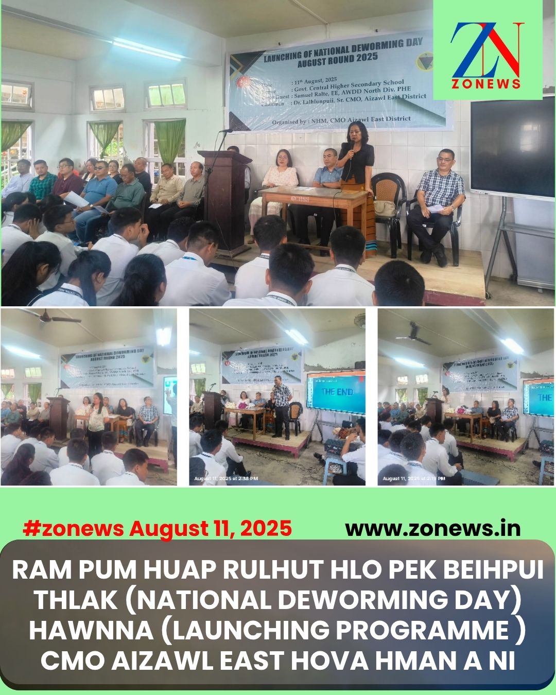 #ZONEWS Aizawl August 11, 2025: Vawiin khan CMO Aizawl East District hovin ram pum huap rulhut hlo pek beihpui thlakna programme (National Deworming Day) hawnna hun ( launching programme) , Government Central Higher Secondary School, College Veng-ah hman a ni a.He rulhut hlo pek beihpui thlak hian rulhut vanga naupang thisen tlachham leh hrisel lohna hrang hrang a thlen theih tihbo hi a tum a ni.