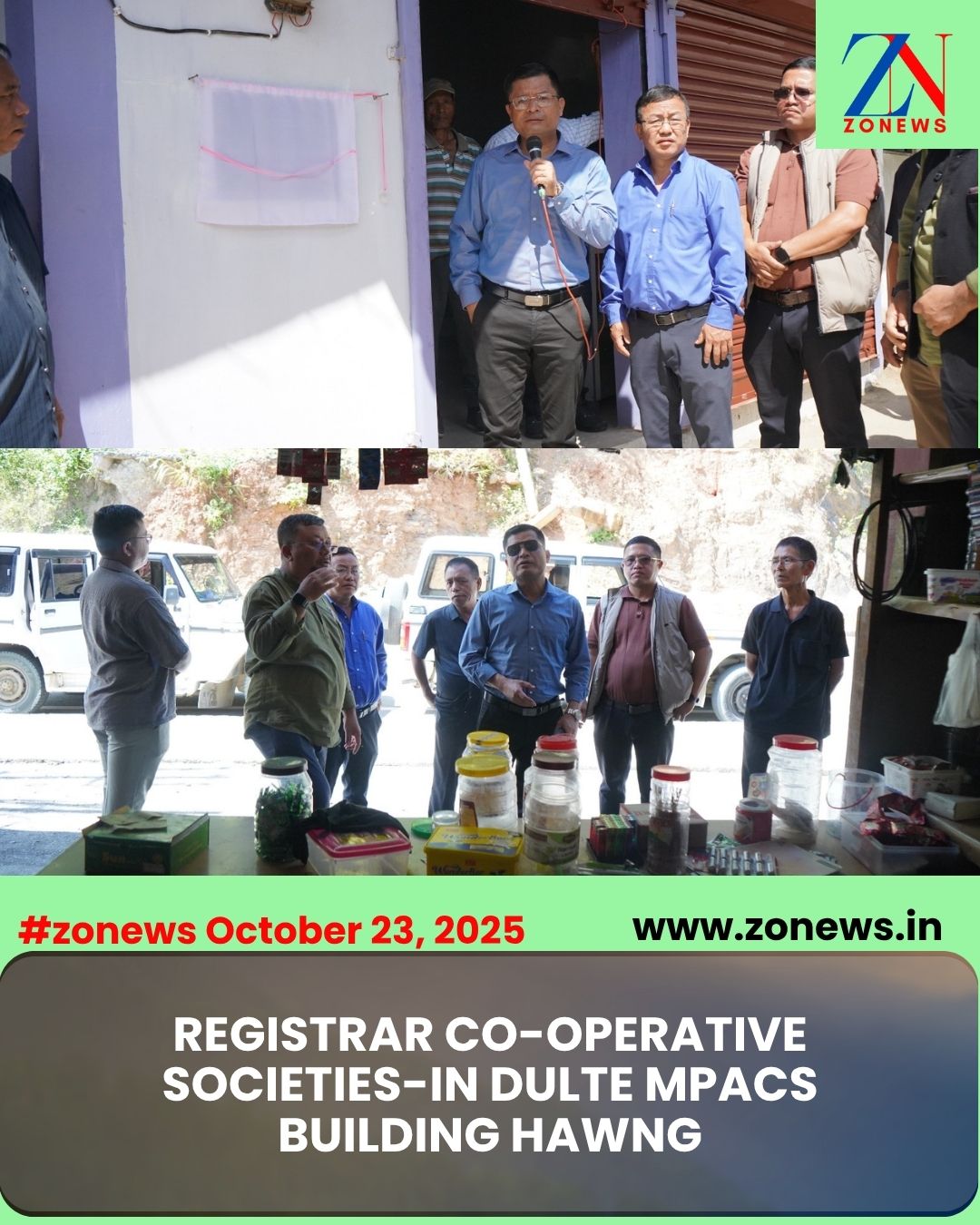 #ZONEWS Khawzawl October 23, 2025: Dulte Multipurpose Primary Agriculture Credit Societies Building cheng nuai 8 senga sak chu vawiin chawhma dar 10 khan Pu John LT Sanga, Registrar Cooperative Societies chuan a hawng.