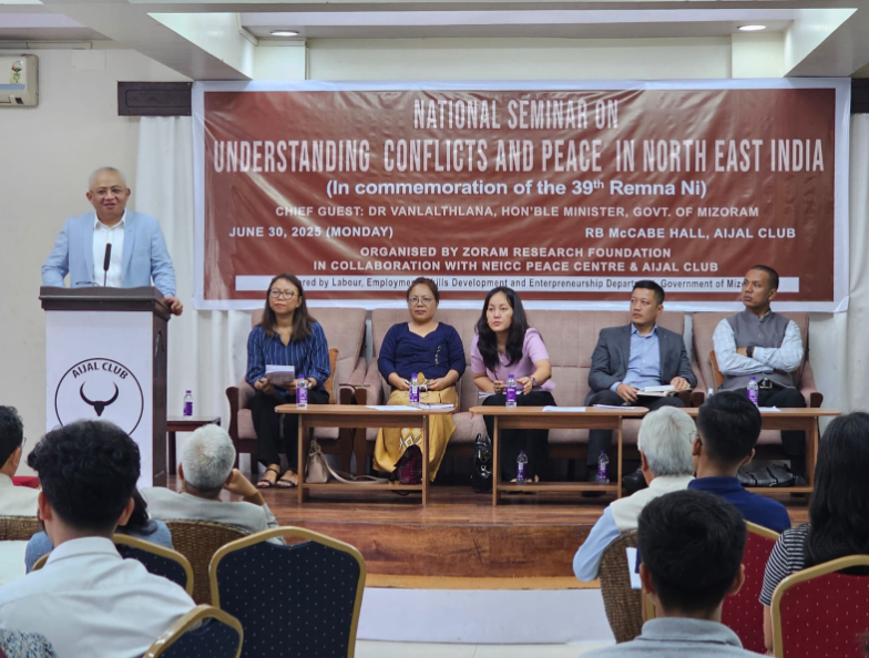 Aizawl, June ni 30, 2025: Vawiin khan Remna Ni pualin Aijal Club-ah India hmarchhaka innghirnghona kara remna leh muanna chungchang zirhona ‘National Seminar on Understanding Conflicts and Peace in North East India’ tih chu buatsaih a ni a. He hun hi Zoram Research Foundation (ZORF) leh NEICC Peace Centre, Shillong leh Aijal Club-te tangkawpin an buatsaih a ni a. I&PR, P&S Minister Dr. Vanlalthlana chu khuallian niin a hmanpui a ni.