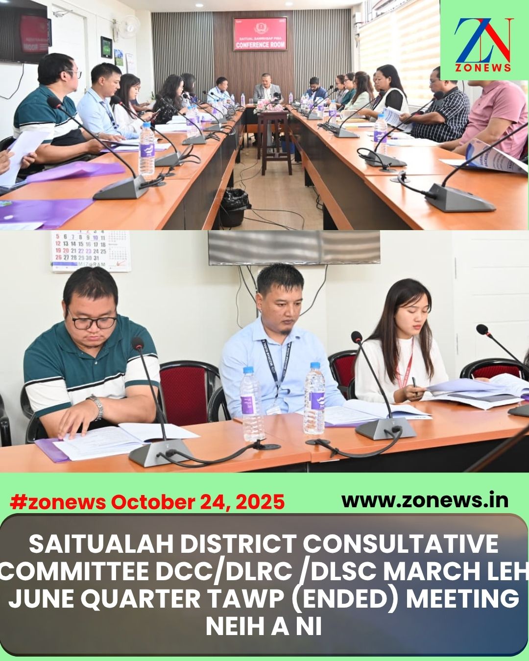 #ZONEWS Saitual October 24, 2025: Vawiin khan Dr. Lalngura Tlau, Saitual DC hovin Saitual DC Conference Room-ah District Consultative Committee (DCC/DLRC/DLSC) March &June 2025 Quarter tawp meeting neih a ni a, he hunah hian Lalnghawrliana, Lead District Manager & member secretary, Pi Lalhmachhuani, DDM, NABARD, Pu J.Lalhmahruaia, BDO, Phullen, Pi Dorothy Muansangi, BDO, Ngopa leh line department hrang hrang aiawh te, Saitual District chhunga bank hrang hrang hotute bakah NGO aiawhte an tel a ni.