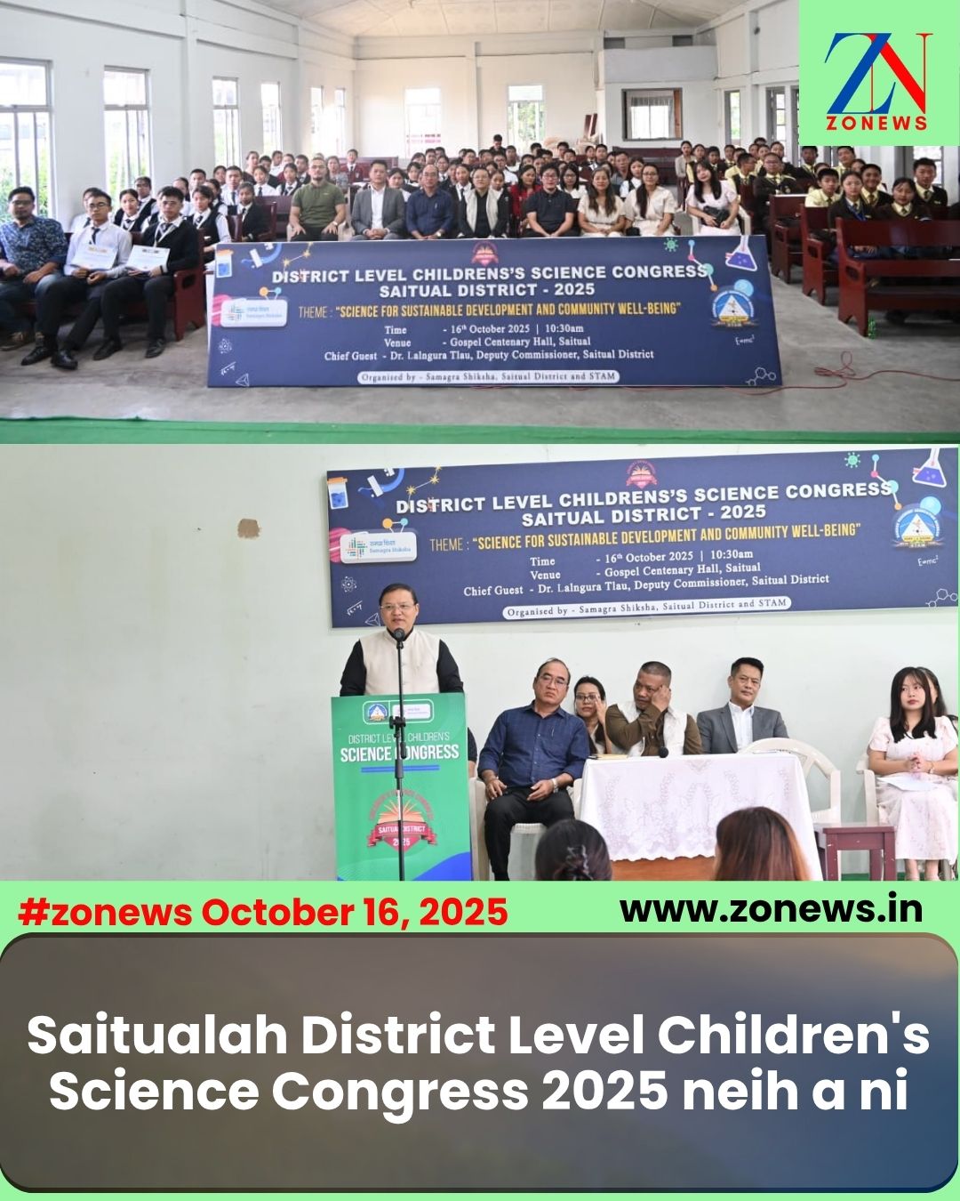 #ZONEWS Saitual October 16, 2025: Vawiin khan Gospel Centenary Hall, Saitual Venglaiah Samagra Shiksha, Saitual leh STAM tangkawp buatsaih District Level Children’s Science Congress 2025 neih a ni a, District Bawrhsap Dr. Lalngura Tlau chu khuallian niin hun a hmanpui.