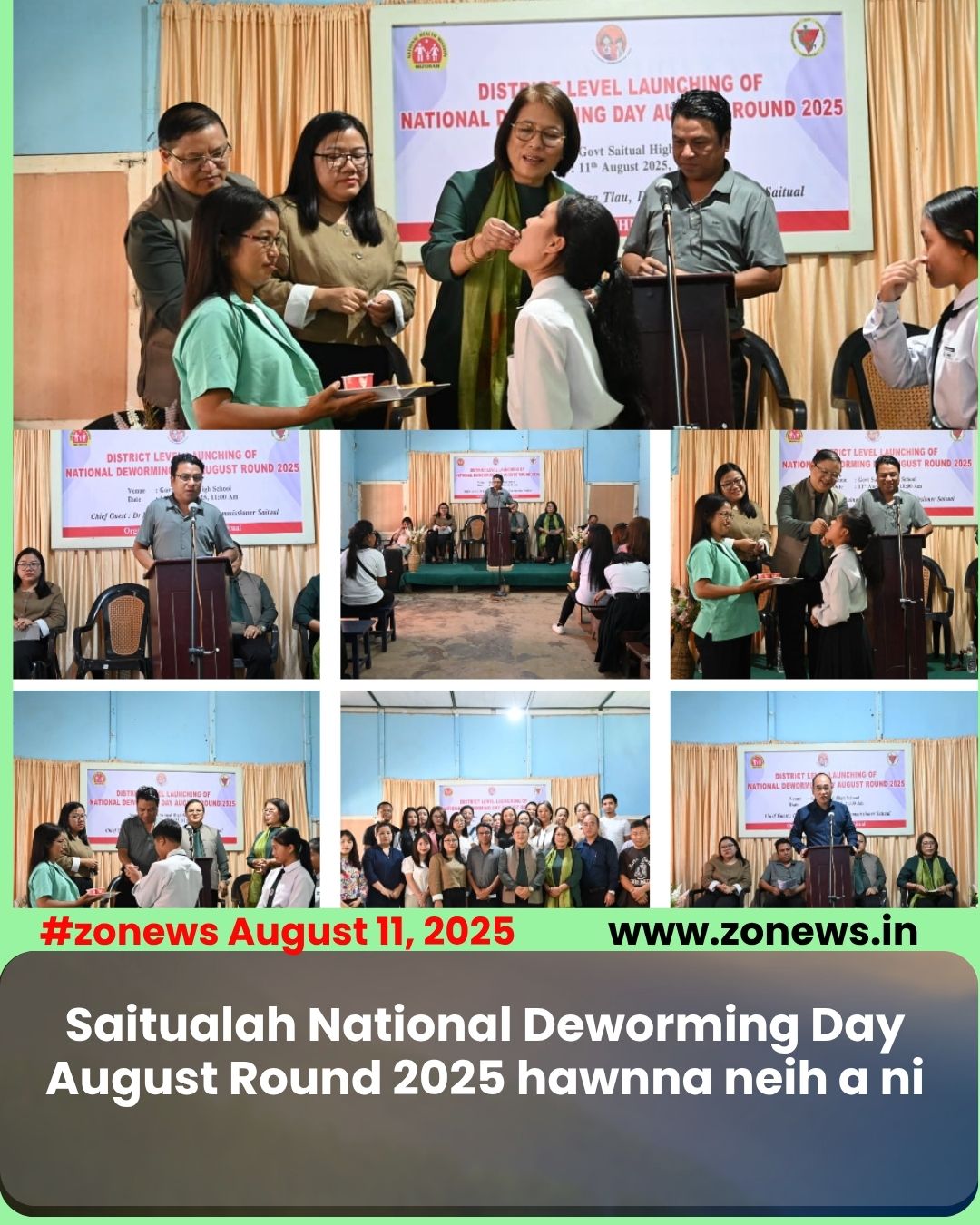 #ZONEWS Saitual August 11, 2025: Vawiin khan Govt. Saitual High School, Saitual Chawnpui Vengah naupang kum 1 atanga 19 inkar ten rulhut an pai lohna tura rulhut hlo pek beihpui leh rulhutin a nghawng thalote inzirtirna, National Deworming Day (NDD) August Round 2025 hawnna hun hman a ni a, Pu Lallawmawma, Addl. DC chu khuallian niin a hawng nghal a ni.