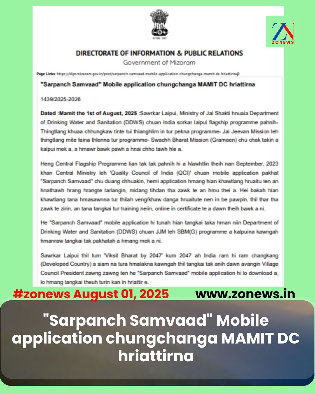 #ZONEWS Mamit August 01, 2025 :Sawrkar Laipui, Ministry of Jal Shakti hnuaia Department of Drinking Water and Sanitation (DDWS) chuan India sorkar laipui flagship programme pahnih- Thingtlang khuaa chhungkaw tinte tui thianghlim in tur pekna programme- Jal Jeevan Mission leh thingtlang mite faina thlenna tur programme- Swachh Bharat Mission (Grameen) chu chak takin a kalpui mek a, a hmawr bawk pawh a hnai chho tawh hle a.
