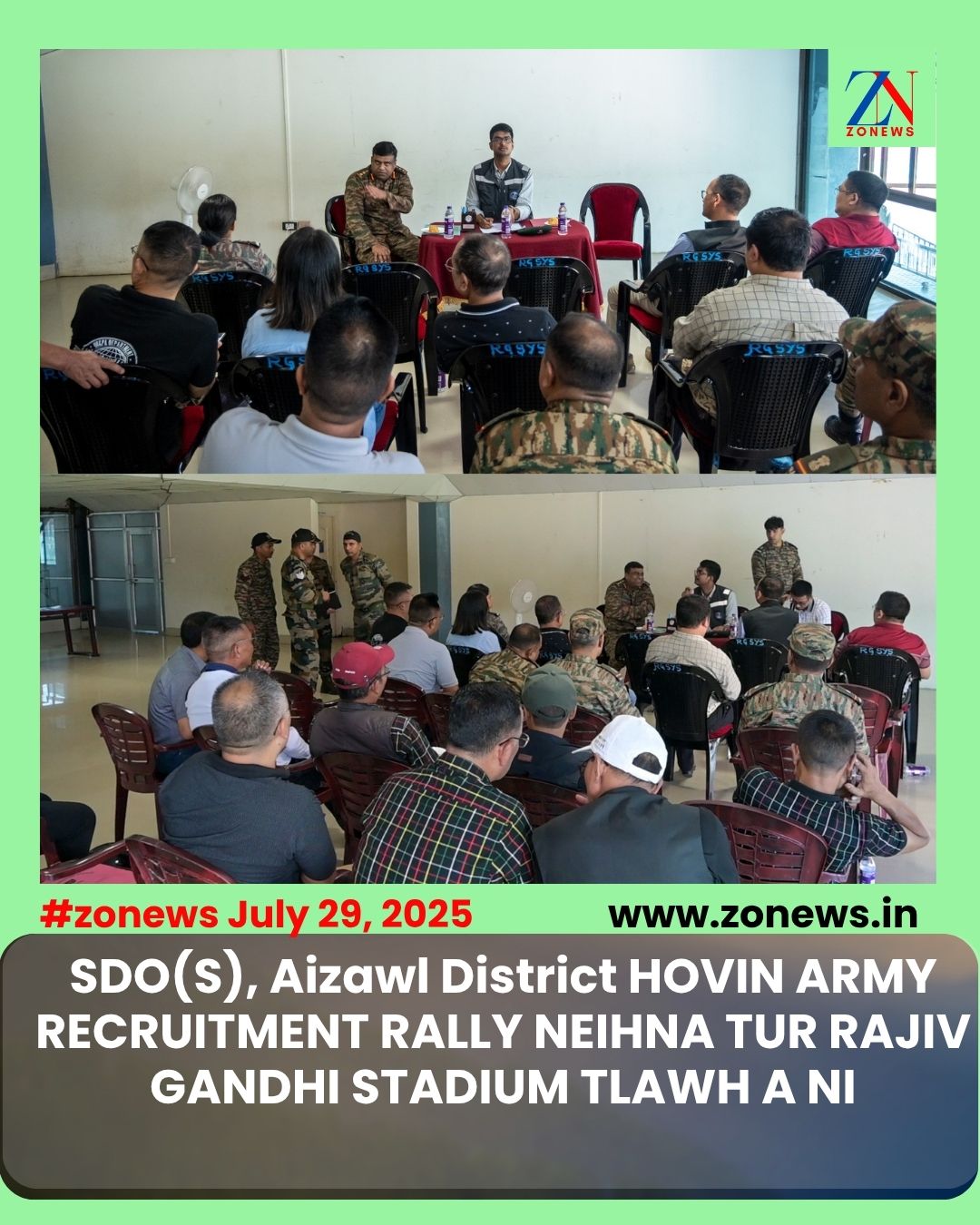 #ZONEWS Aizawl July 30, 2025: Vawiinah khan SDO(S), Aizawl District Pu Srinivas Sadi, IAS kaihhruaina hnuaia nithum chhung (7th-9th August,2025) Sipai lak Runpui ( Army Recruitment rally) neihna tur hmun Rajiv Gandhi Stadium, Mualpui, Aizawl chu Army Recruitment Office’s official te, mawhphurhna nei department aiawh te , Salem veng Local council leh YMA aiawh te leh NGO aiawh te nen tlawhin, Army Recruitment Rally tha taka neih a nih theih nana mawhphurhna chanvo neih department, LC leh YMA te inpuahchah dan te thlirho a ni.