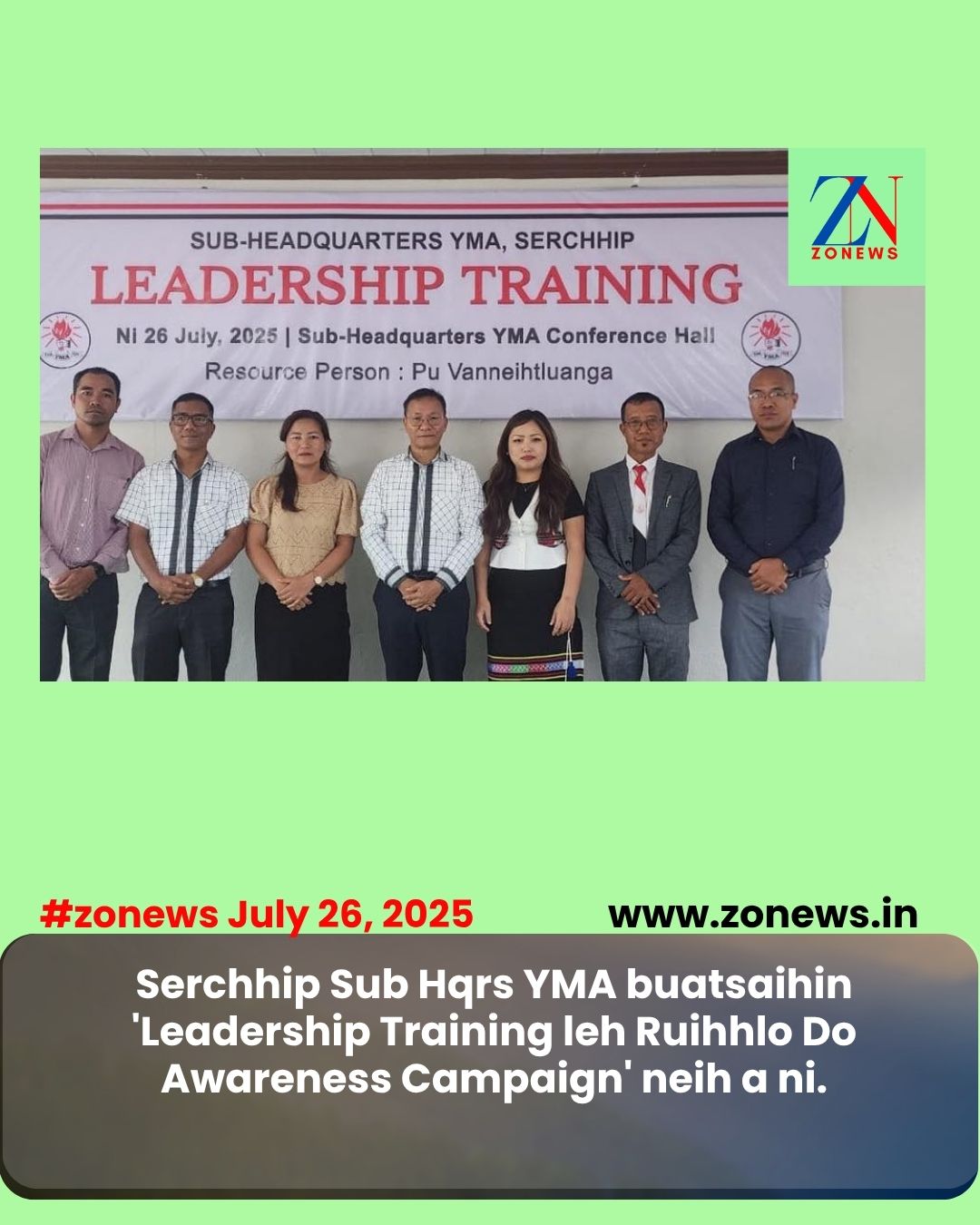 #ZONEWS July 26, 2025: Vawiin June ni 26, Inrinni hian Serchhip Sub Hqrs YMA Hall a ‘Serchhip Sub Hqrs YMA buatsaihin ‘Leadership Training cum Ruihhlo Do Awareness Campaign’ programme hun khatna ‘Leadership Training’ programme ah hian Resource Person Pu Vanneihtluanga chuan Serchhip Town chhung leh Serchhip Sub Hqrs YMA in direct a awp YMA Branch 7 aiawh a kalkhawmte chu YMA Hruaitu nihna leh mawhphurhna /chanvo te, YMA inkaihhruaina dan dik leh fel chungchangte,Hruaitu tha ni tura hriattur pawimawh hrang hrang te,’Kohhran leh YMA’ & ‘Sawrkar leh YMA’ chungchanga a paper buatsaih chu zirpuiin, YMA kalphung zel tur atan zawhna leh chhanna te leh sawihona hun hlawktak a hmanho ani bawk.