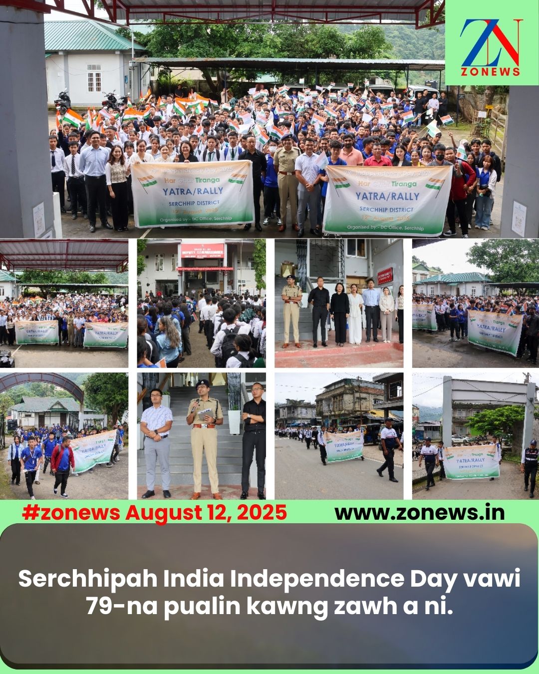 #ZONEWS Serchhip August 12, 2025: Vawiin khan Serchhip khawpuiah India Independence Day vawi 79na lawmna peng pakhat atan Tiranga Yatra neih a ni a. School naupang te, college zirlai te leh mipui mimir thahnem takin kawng an zawh a ni.
