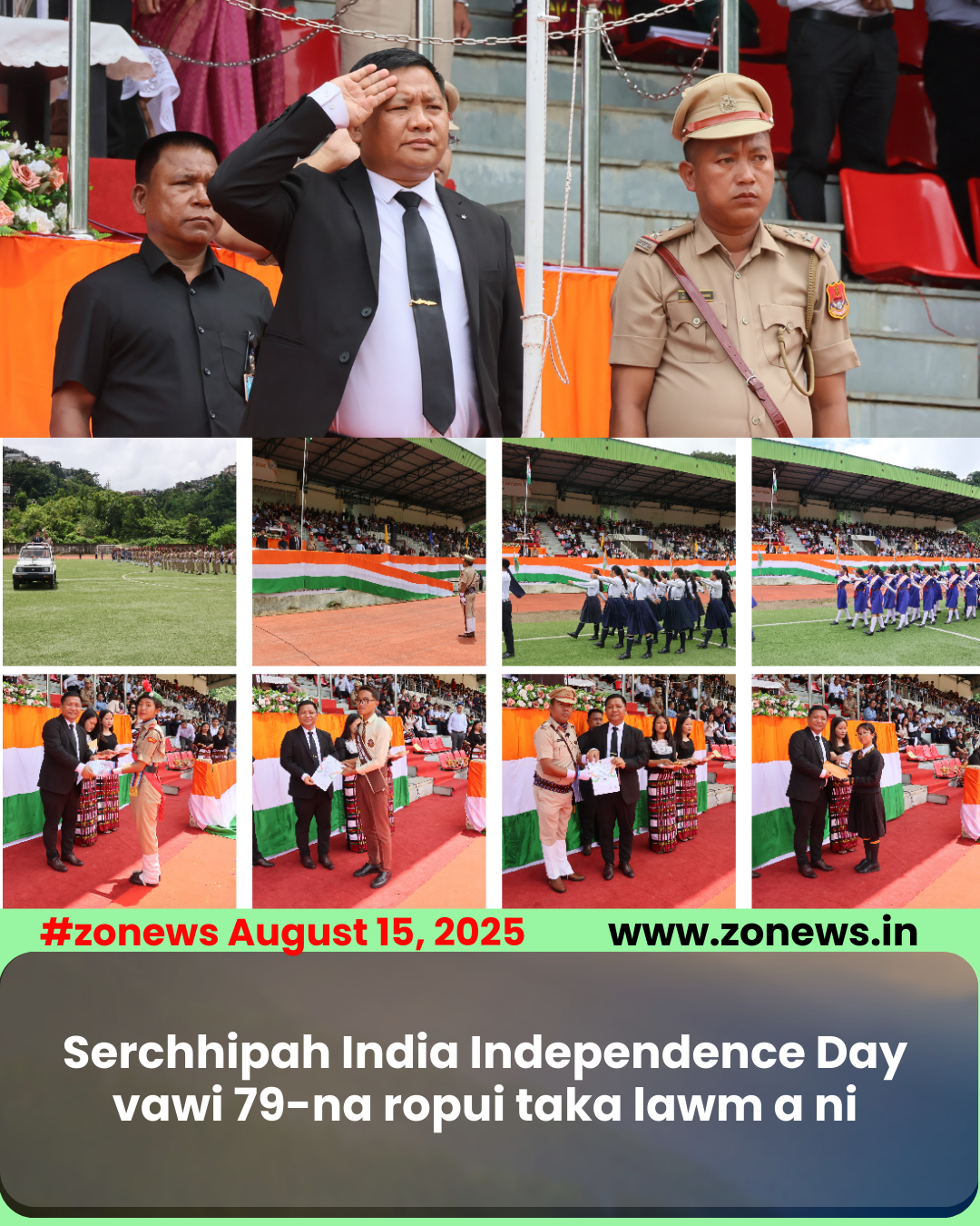 #ZONEWS Serchhip August 15, 2025: Vawiin khan Serchhip District chhung hmun hrang hrangah India zalenna ni vawi 79 na lawm a ni a. A lawmna pui ber chu Serchhip Sports Complex ah neih niin khuallian Supply Minister Pu B.Lalchhanzova chuan tukin dar 10 khan hnam puanzar a pawt pharh a ni.
