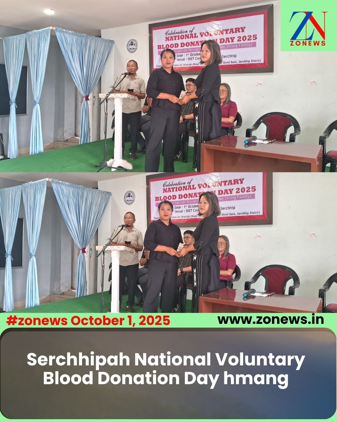 #ZONEWS Serchhip, October1, 2025: Kumtin October 1-a hman thin, ‘National Voluntary Blood Donation Day’ chu Vawiin khan Serchhip-ah pawh SDO (Sadar) Pi Rebecca Laldinmawii Hrahsel hovin hman a ni a, Hmeichhia thisen pe tam te hnenah chawimawina hlan an ni.