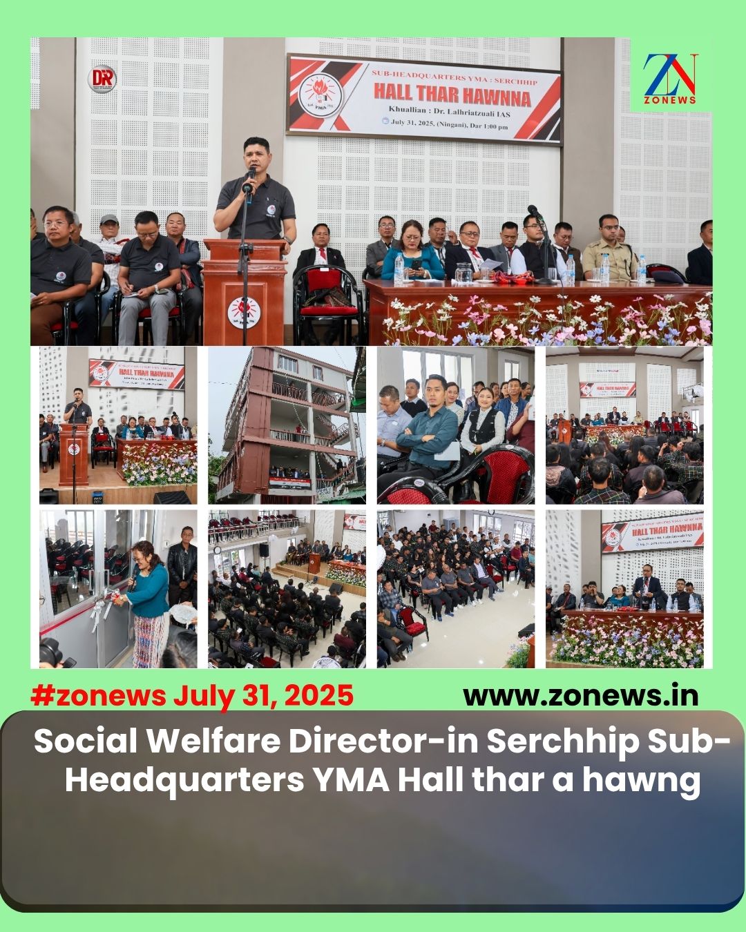 #ZONEWS Serchhip July 31, 2025: Social Welfare Director Dr Lalhriatzuali Ralte chuan Serchhip Sub-Headquarters YMA Building zauhna (vertical extension) leh a chhunga Hall thar chu vawiin chawhnua programme buatsaihah a hawng.