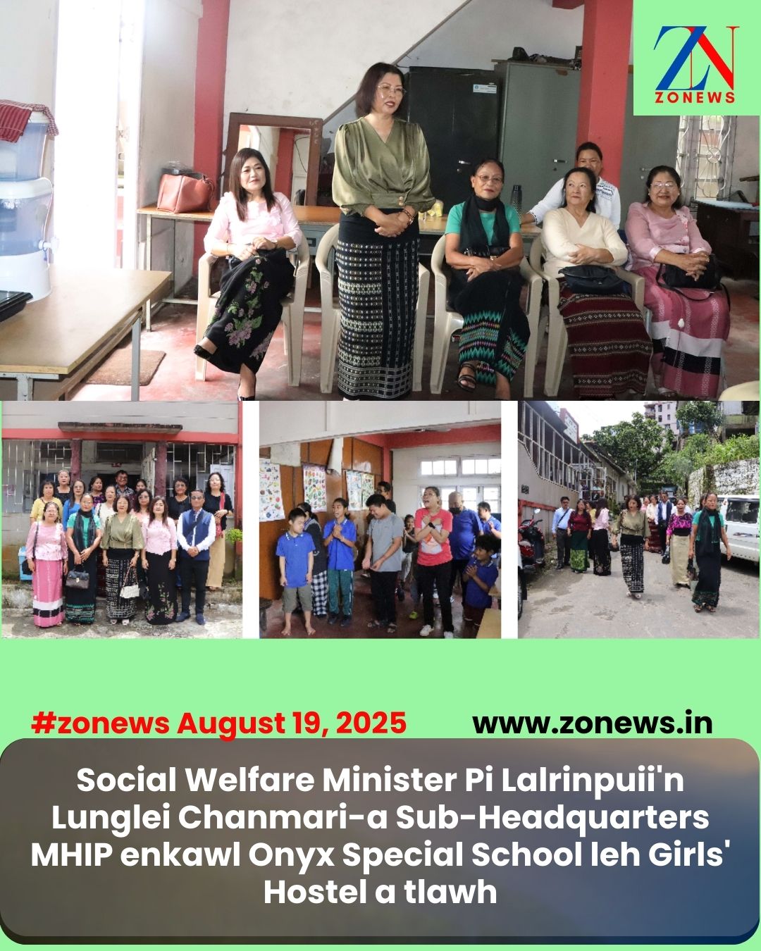 #ZONEWS Lunglei August 19, 2025: Vawiin khan Mizoram sawrkara Social Welfare, Women & Child Development Minister Pi Lalrinpuii chuan Lunglei Chanmari-a Lunglei Sub-Headquarters MHIP (Mizo Hmeichhe Insuihkhawm Pawl) enkawl, vohbikte enkawlna sikul, Onyx Special School leh zirlai leh hna thawka awm hmeichhiate awmna – Girls’ Hostel tlawhin, an dinhmun a enfiah.