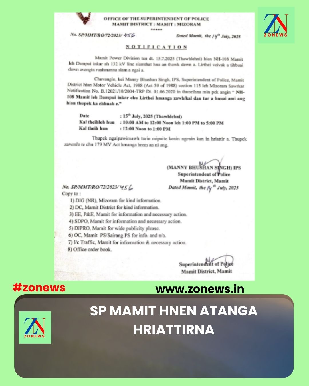 #ZONEWS July 14, 2025 : Mamit Power Division ten dt. 15.07.2025 (Thawhlehni) hian NH-108 Mamit leh Dampui inkarah 132 KV line siamthat hna an thawk dawn a,lirthei veivak a tihbuai dawn avangin ruahmanna siam a ni.