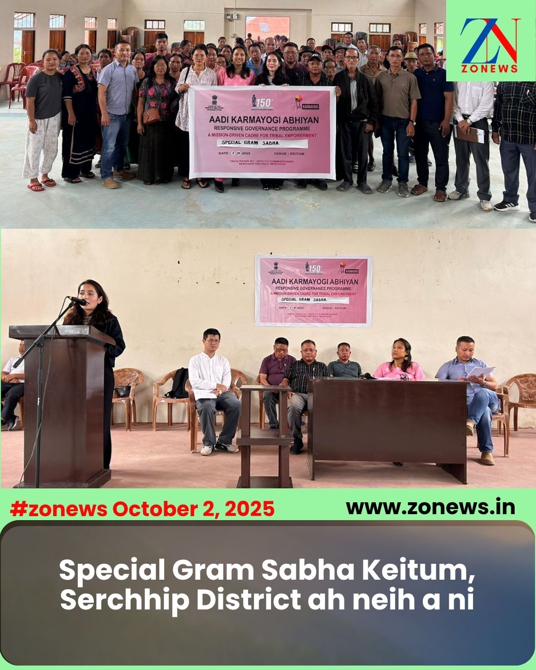 #ZONEWS Serchhip October 2, 2025 : Ministry of Tribal Affairs hnuaia Aadi Karmayogi Abhiyan chu kalpui mek niin tribal khua chawikanna tur leh hmasawnna hmathlir siam nan, Serchhip District chhunga Keitum chu Pilot Village-ah thlan niin vantlang inkhawm, Special Gram Sabha koh a ni a, khaw chhung hmasawnna atana ruahmanna hrang hrang rel ho a ni.