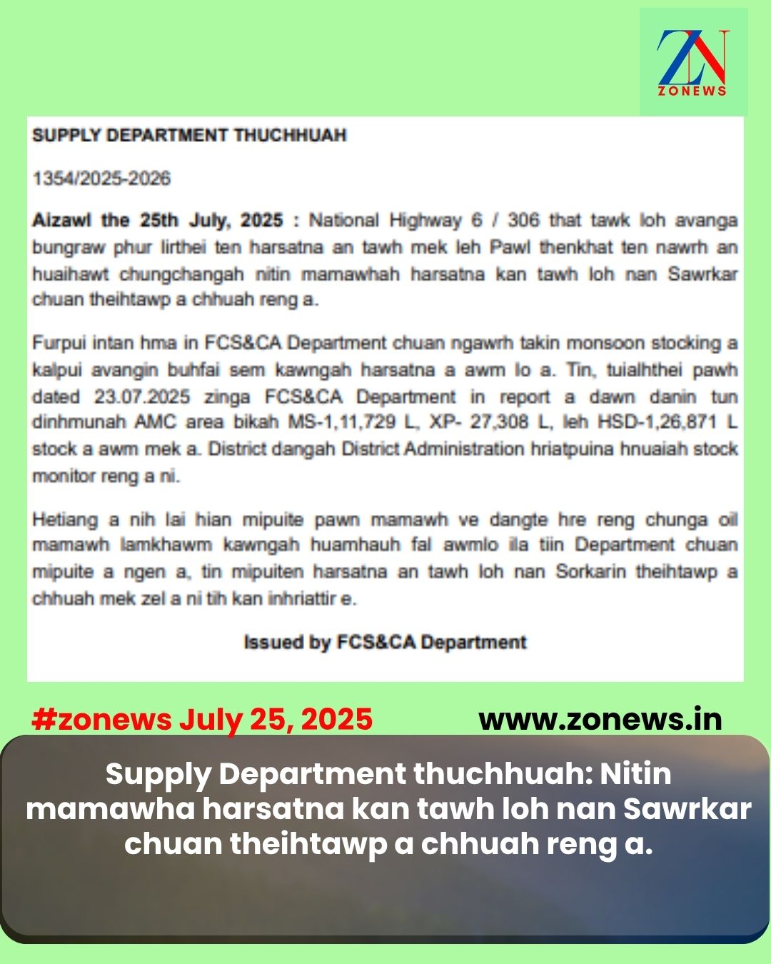 Furpui intan hma in FCS&CA Department chuan ngawrh takin monsoon stocking a kalpui avangin buhfai sem kawngah harsatna a awm Io a. Tin, tuialhthei pawh dated 23.07.2025 zinga FCS&CA Department in report a dawn danin tun dinhmunah AMC area bikah MS-1,11,729 L, XP- 27,308 L, leh HSD-1,26,871 L stock a awm mek a. District dangah District Administration hriatpuina hnuaiah stock monitor reng a ni.