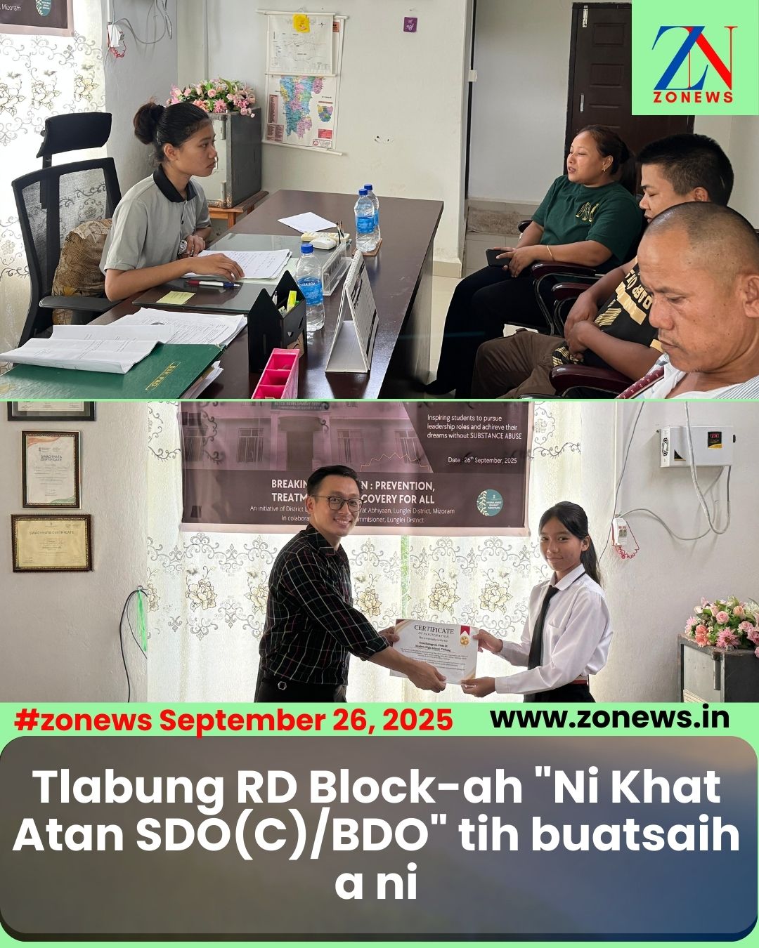 #ZONEWS Lunglei Septeber 26, 2025: Nasha Mukt Bharat Abhiyaan hnuaia ruihhlo do beihpui peng khat atana Lunglei Deputy Commissioner (Bawrhsap) hma lakna kal zelah, vawiin khan Tlabung RD Block-ah hlawhtling takin “Ni Khat Atan SDO(C)/BDO (Be a SDO(C)/BDO for a Day)” tih hun buatsaih a ni a. Tlabung RD Block-a zirlai naupang paruk chu SDO(C)/BDO hna thawh dan a taka an hriatna tur leh mawhphurhna pawimawh la ngam tura fuih phurtu atan SDO(C)/BDO ṭhutthleng luahtir an ni.