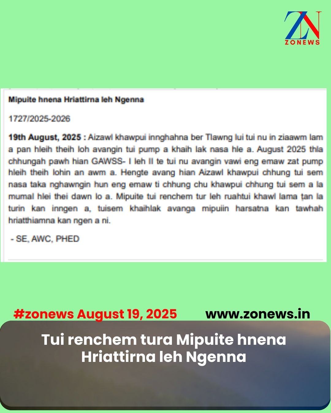#ZONEWS Aizawl August 19, 2025 : Aizawl khawpui innghahna ber Tlawng lui tui nu in ziaawm lam a pan hleih theih loh avangin tui pump a khaih lak nasa hle a. August 2025 thla chhungah pawh hian GAWSS- I leh II te tui nu avangin vawi eng emaw zat pump hleih theih lohin an awm a. Hengte avang hian Aizawl khawpui chhung tui sem nasa taka nghawngin hun eng emaw ti chhung chu khawpui chhung tui sem a la mumal hlei thei dawn lo a. Mipuite tui renchem tur leh ruahtui khawl lama ṭan la turin kan inngen a, tuisem khaihlak avanga mipuiin harsatna kan tawhah hriatthiamna kan ngen a ni.