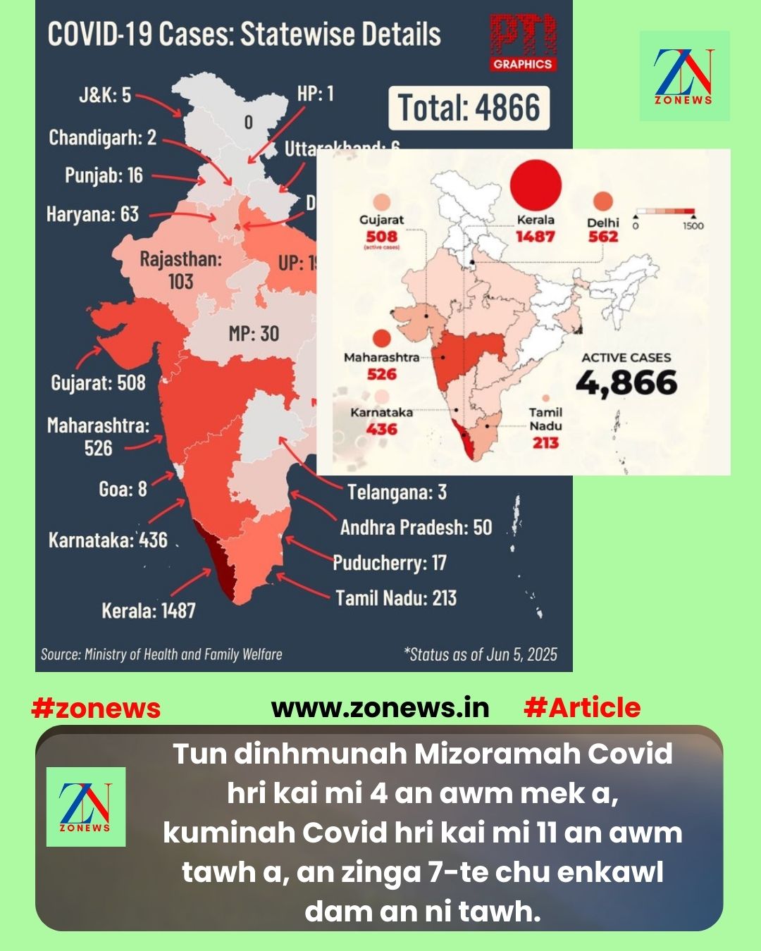 #ZONEWS July 14, 2025: Tun dinhmunah Mizoramah Covid hri kai mi 4 an awm mek a, kuminah Covid hri kai mi 11 an awm tawh a, an zinga 7-te chu enkawl dam an ni tawh.
