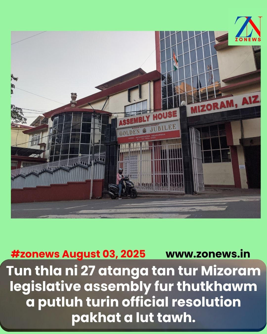 #ZONEWS August 03, 2025: Assembly secretariat atanga thu dawn danin fur thutkhawm laia official resolution putluh tur hi environment, forests & climate change department atanga lut, a changtu minister Pu Lalthansanga putluh tur a ni . Zirtawpni thleng kha chuan zawhna lut a la awm lova, sorkar lam atangin dan thar siam tur emaw dan dinglai siamthat tur duan lawk emaw thehluh a la awm lo bawk. Assembly inkhawm rei zawng tur leh hun hman dan tur hi August ni 6-a business advisory committee (BAC) thukhawmin an rel dawn a. BAC hi assembly speaker Pu Lalbiakzama kaihhruai niin parliamentary affairs minister bakah legislature party tin aiawhte chu member an ni.