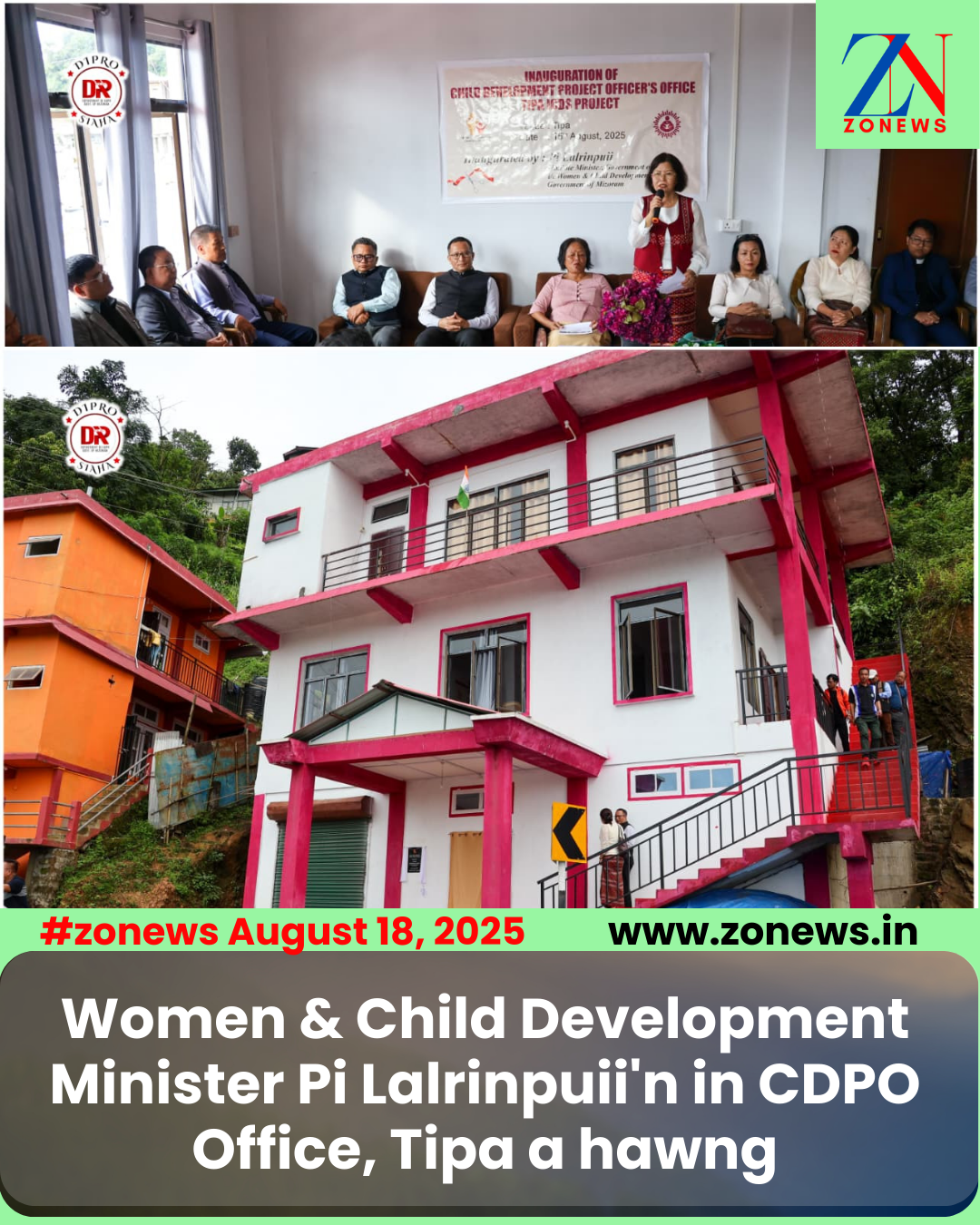 #ZONEWS Siaha August 18, 2025: Social Welfare & Tribal Affairs, Women & Child Development Department Minister Pi Lalrinpuii chuan ni 15 zirtawpni khan Child Development Project Officer (CDPO) Office, chu Siaha District, Tipa-ah a hawng.